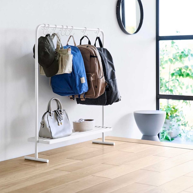 -     バッグ収納ハンガー 山崎実業 tower タワー バッグ収納ラック 10157 ホワイト ¥7,920 SOLD OUT 当ショップは国内正規品(新品)のみ取り扱いのため、安心してお買い求め頂けます。 かさばって収納場所に困るバッグをすっきり整頓できる収納ラックです。バッグ以外の小物収納にも便利で、ラックには外れにくい構造のフックが8個付いています。棚下はロボット掃除機が通れる高さがあり、お掃除もスムーズです。 ●商品の情報 ・ブランド:YAMAZAKI(山崎実業)/日本 ・ジャンル:バッグ収納ラック ・主な素材:スチール 粉体塗装(フレーム、棚、フック)/ポリプロピレン、シリコーンゴム(キャップ) ・サイズ:約W800xD206xH925mm ・内寸サイズ:約W763xD200mm(棚)/約H710mm(フック下から棚上)/約H120mm(棚下)/約27mm(フック開口幅) ・重量:約3200g ・耐荷重:ハンガー部16kg(フック1つあたり3kg 但し合計最大16kgまで)/棚5kg ※静止荷重 ・付属品:六角レンチ ・その他:お客様組立て品となります。 ●ご購入前にお読みください ・ご購入後の返品や交換はできません。 ・撮影環境や閲覧環境により、写真と色合い等が異なる場合がございます。 山崎実業 YAMAZAKI タワー tower バッグ収納ラック バッグ収納ラック タワー バッグ収納スタンド バッグ収納ハンガー かばん 鞄 スリム コンパクト 壁付け 壁掛け 壁面収納 便利グッズ アイデア商品 アイデア収納 収納アイデア 新築祝い 引っ越し祝い 引越し祝い ギフト プレゼント インテリア おすすめ ベーシック シンプル スマート おしゃれ 白 黒 人気ブランド 新品 取扱店 正規品 正規販売店 正規取扱店 個人・法人対応 適格請求書発行事業者 インボイス登録済み セレクトショップ