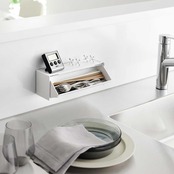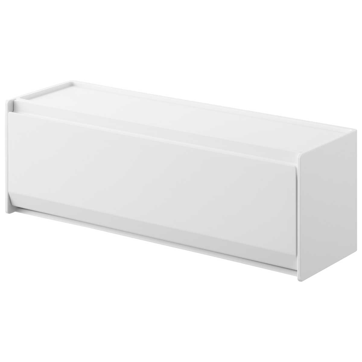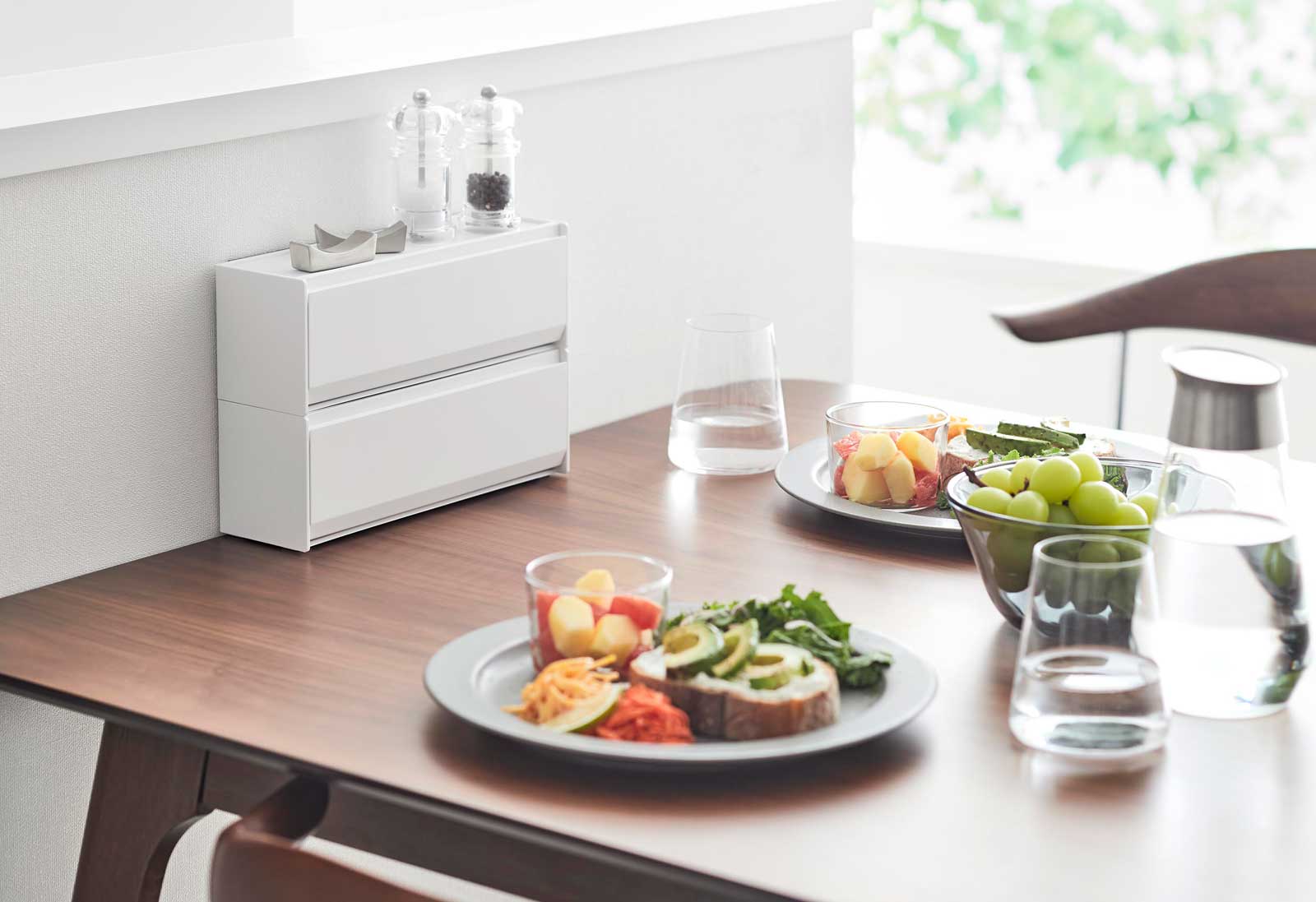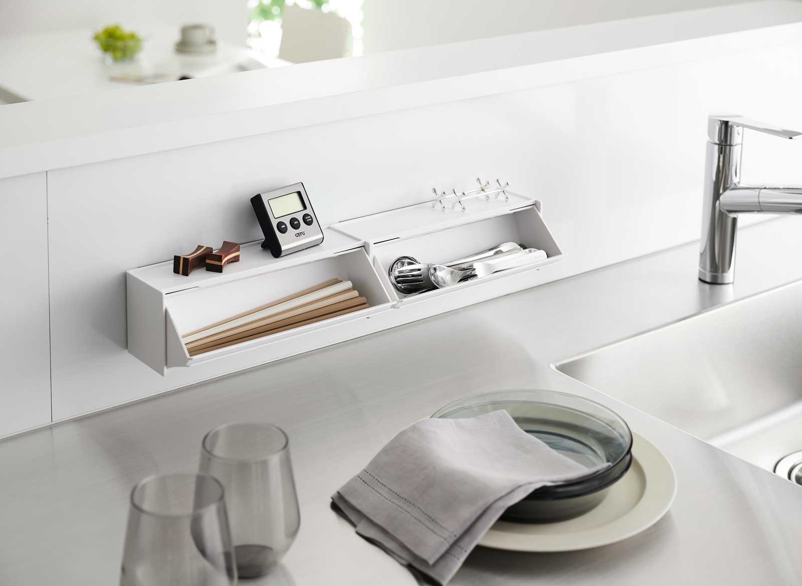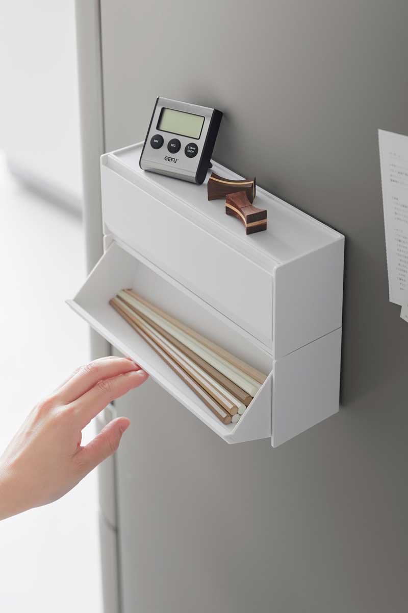 扉は斜めに開口するフラップ式で、片手で簡単にカトラリーを取り出せます。天板はトレーになっているので小物置きとしても便利。冷蔵庫横などにマグネットで設置したり、スパイスニッチやダイニングなどマグネットがつかない場所に置いても使用できます。