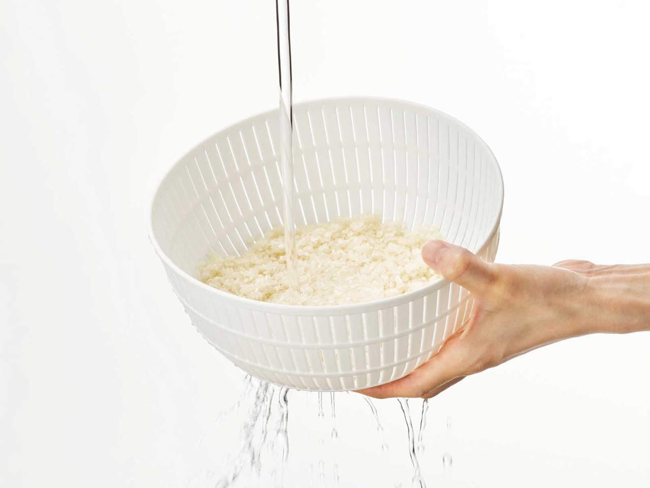 お米をふっくらとみずみずしく炊き上げるための”とぎ方”にこだわったザルとボウルのセット。ザル側面に配した縦スリットで非常に水切れが良く、ヌカや余分な胚芽をサッと流しおとすことができます。また、米粒が割れにくく、米とぎに最適な柔らかさを実現しています。