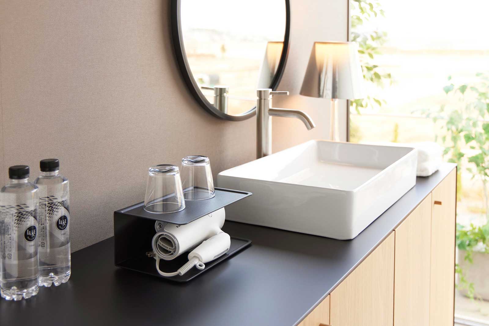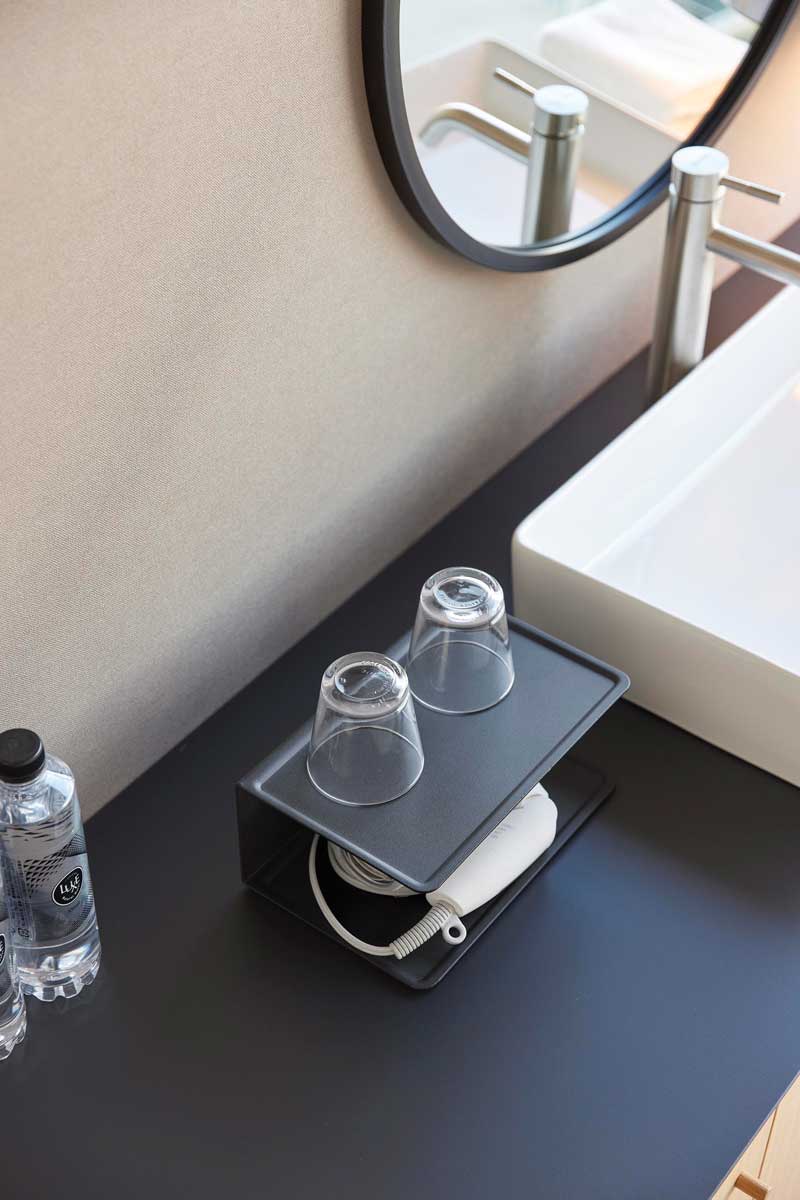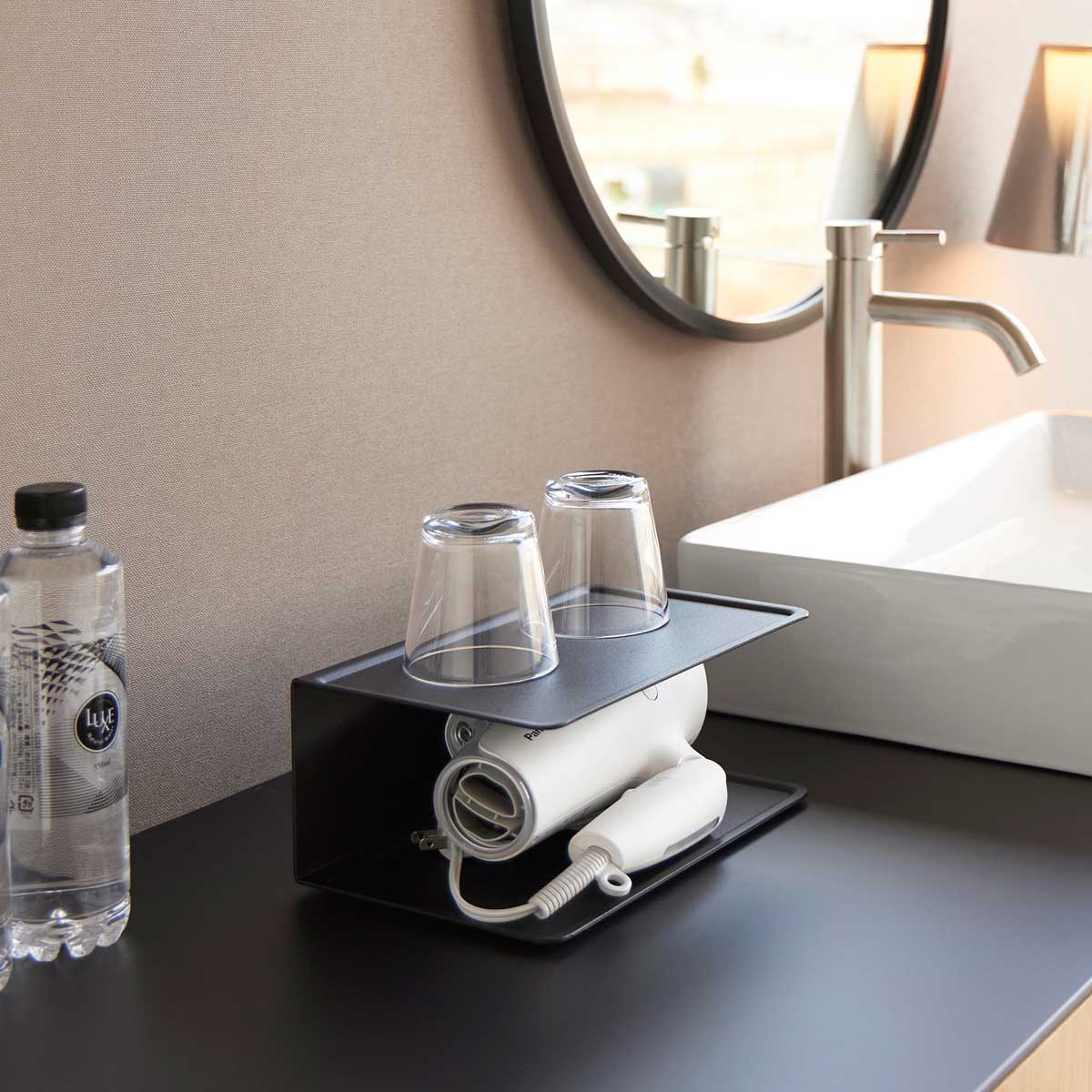 ドライヤーやタンブラーなどの洗面グッズなどのアメニティー収納にぴったりな2段ラックです。2段構造により収納力が倍になるのに、省スペースに設置できるコの字型のラックです。