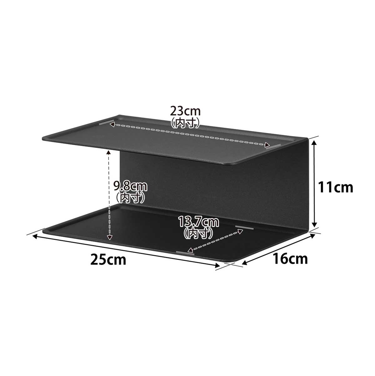 ラック1つ分のスペースで上段と下段に小物が置けて、限られた場所でもすっきりまとめることができます。上段、下段ともに小物が置きやすいトレー形状で、丈夫なスチール製です。