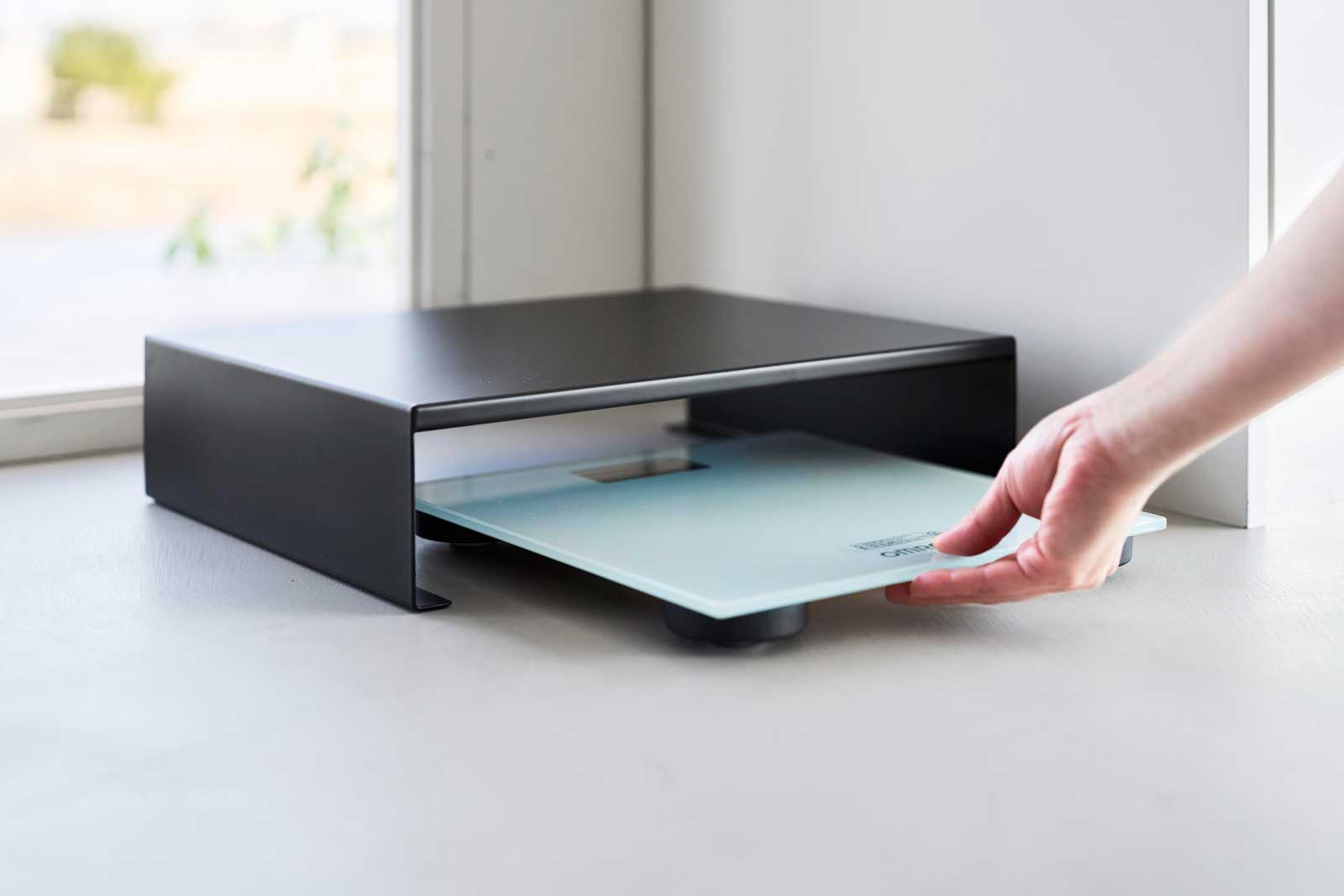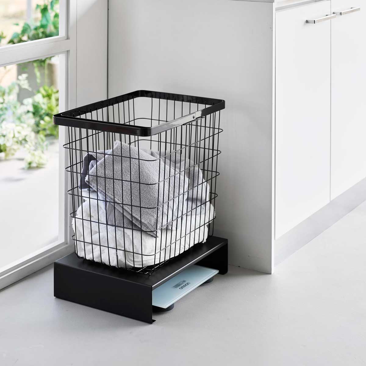 収納した体重計をサッと取り出して量ることができ、ラック上の空間を利用してランドリーバスケットなどを置くことができて便利です。