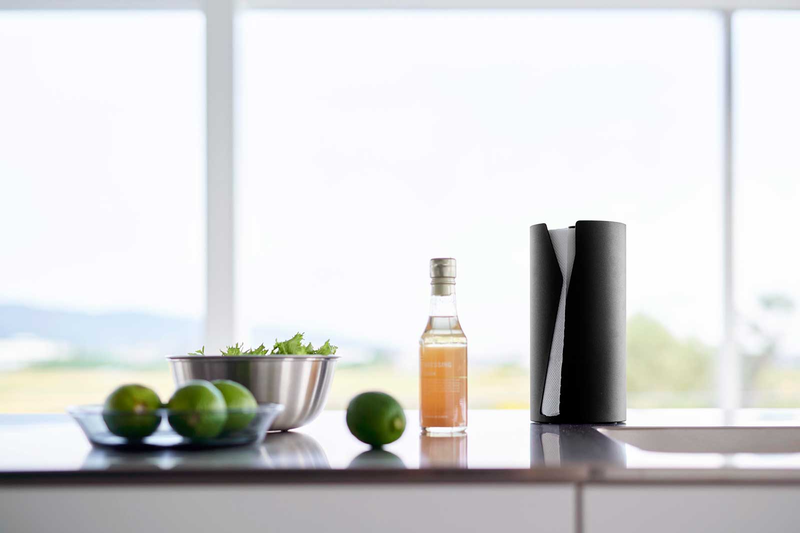 縦置きで省スペース設計のキッチンペーパーホルダーです。国内で販売されている一般的なサイズのキッチンペーパーを収納できます。安定感のある構造で片手でもスムーズに引き出せ、特殊な形状のスリットはペーパーを簡単にカットすることができます。