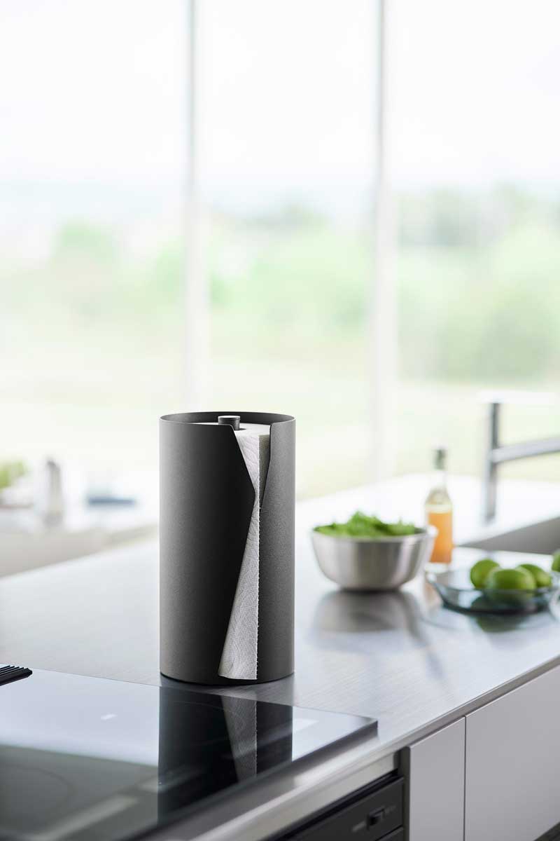 縦置きで省スペース設計のキッチンペーパーホルダーです。海外製の大判タイプのキッチンペーパーを収納できます。安定感のある構造で片手でもスムーズに引き出せ、特殊な形状のスリットはペーパーを簡単にカットすることができます。