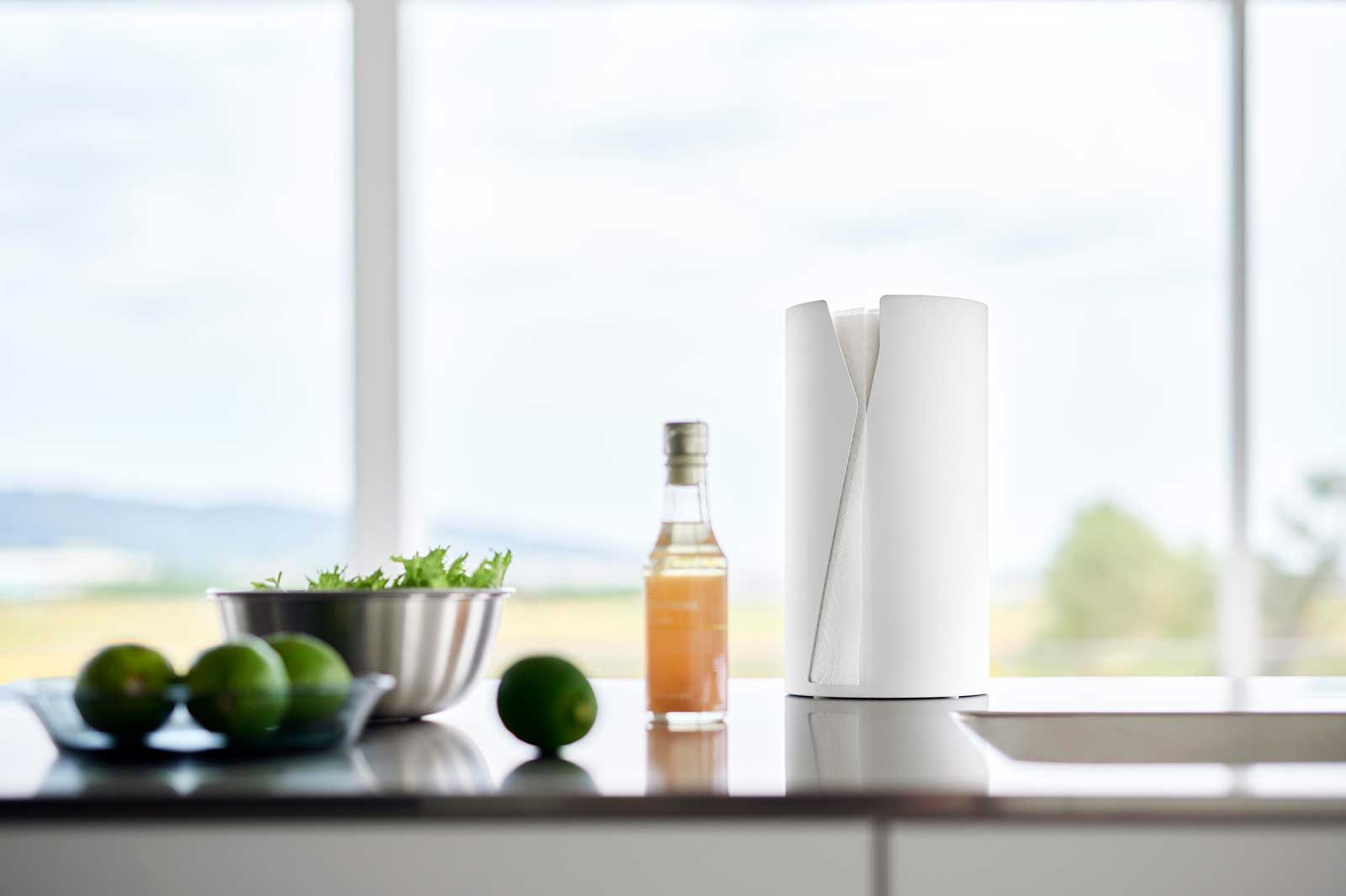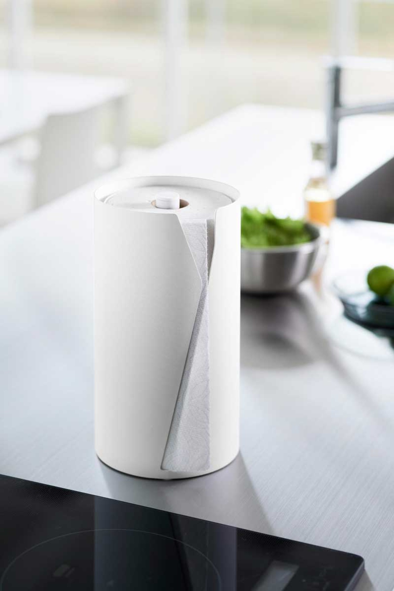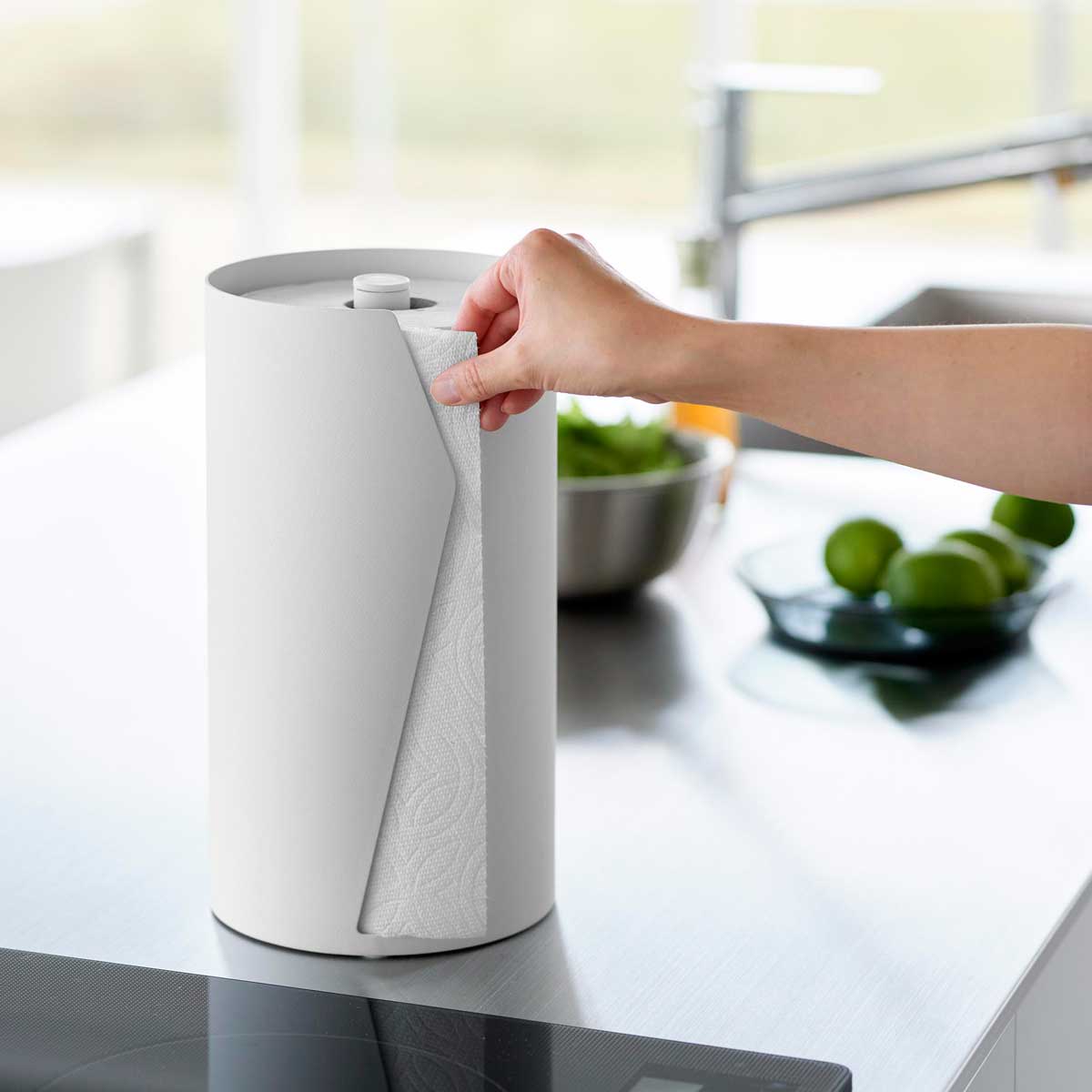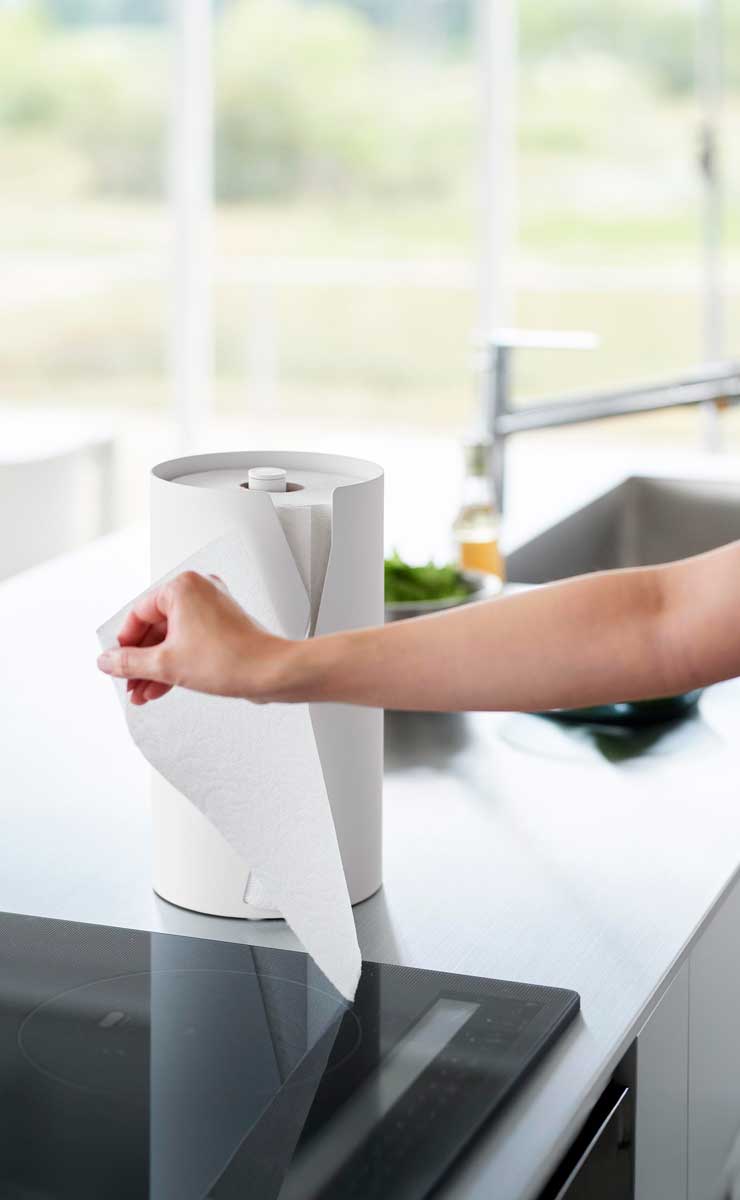 縦置きで省スペース設計のキッチンペーパーホルダーです。海外製の大判タイプのキッチンペーパーを収納できます。安定感のある構造で片手でもスムーズに引き出せ、特殊な形状のスリットはペーパーを簡単にカットすることができます。