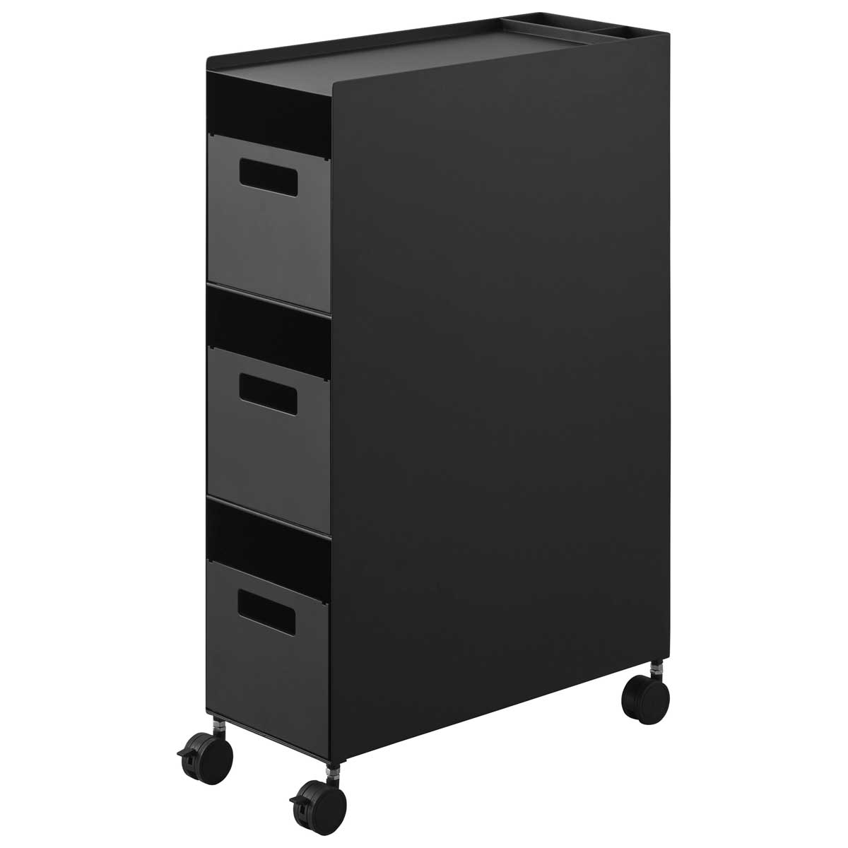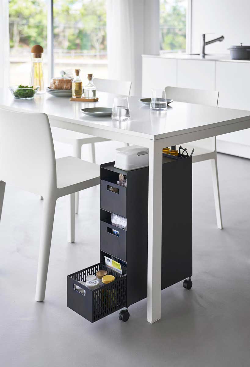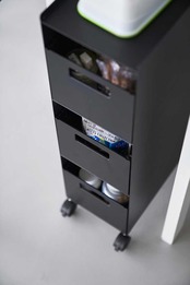 家の中どこでも使えるスリムなバスケットワゴンです。引き出しやすい取っ手付きのバスケット3つに小物をスッキリと収納でき、バスケット内には可動式の仕切りがあるので整理しやすいです。ワゴン背面には便利な収納ポケットもあります。キャスター付きなので移動が簡単です。
