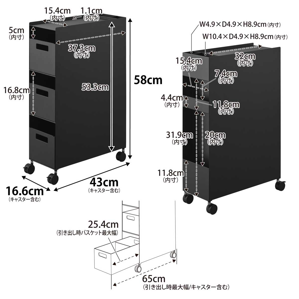 ・サイズ:約W166xD430xH580mm(本体)/約W153xD321xH122mm(バスケット1つあたり)
