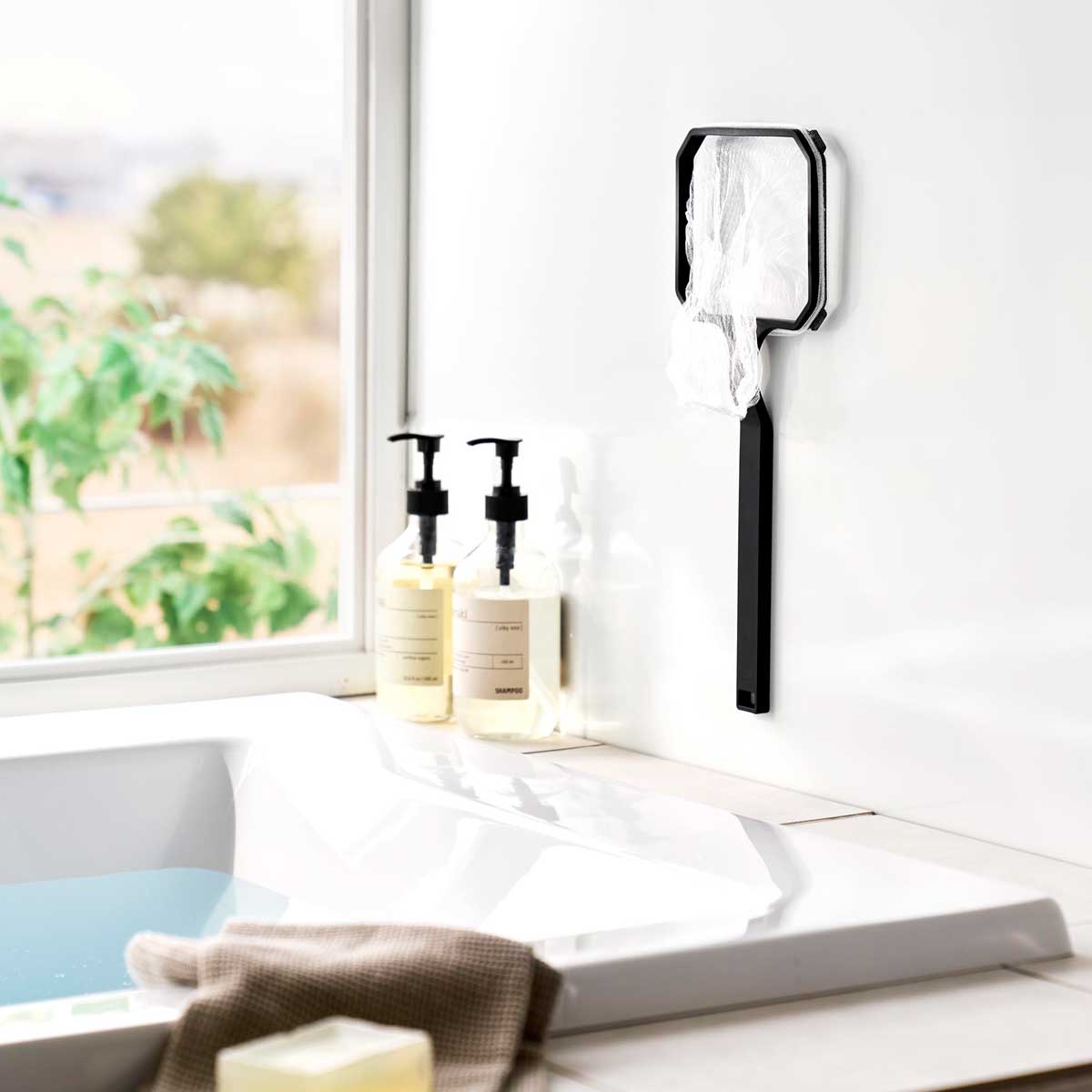 市販の水切りネットで浴槽&洗濯槽のゴミ取りができるホルダー。市販の水切りネットを取り付けて、浴槽や洗濯槽に浮いたゴミの掃除ができるホルダーです。