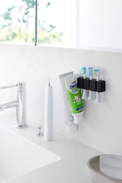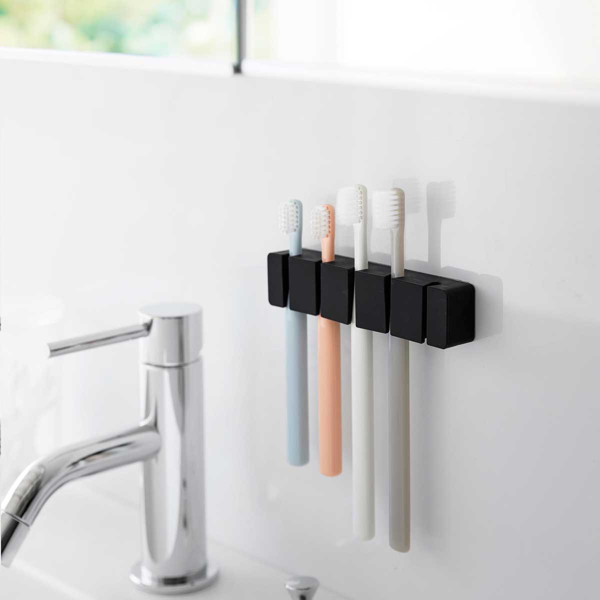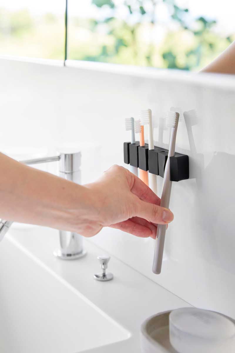 フィルムフックで簡単に取り付けできる、シリコーン製の5連ホルダーです。シリコーン製素材が歯ブラシをしっかりホールドするので、上から差し込んでも収納できます。