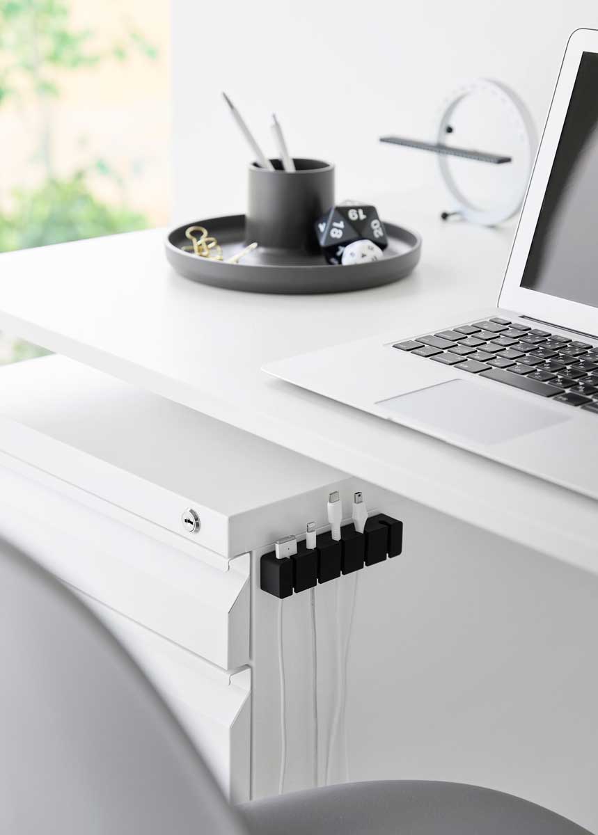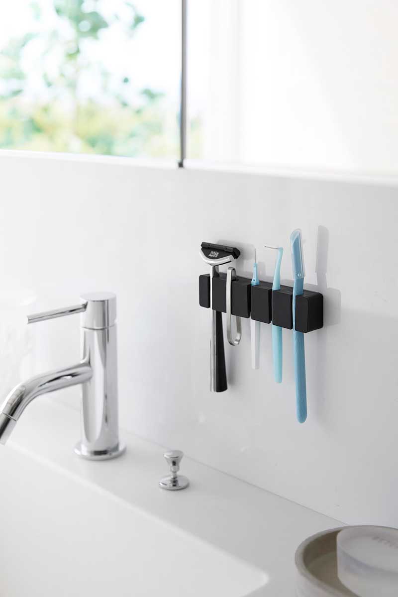 歯ブラシだけでなく、洗面まわりの小物も浮かせて壁面収納できるので、乾きやすく衛生的です。また、充電ケーブルホルダーとして使うのもおすすめです。