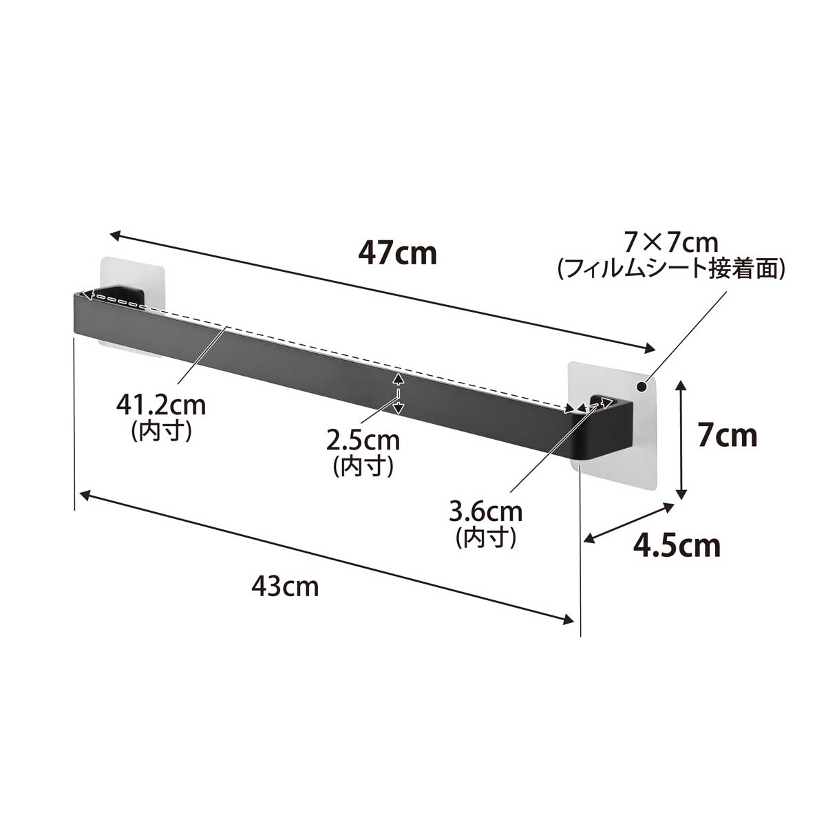 幅43cmの使いやすいタオルハンガーです。フィルムシートを貼るだけで、簡単に設置できるタオルハンガーです。洗濯機の前面など湾曲のある場所にも設置可能で、サッと手を拭ける位置に調節できて便利です。