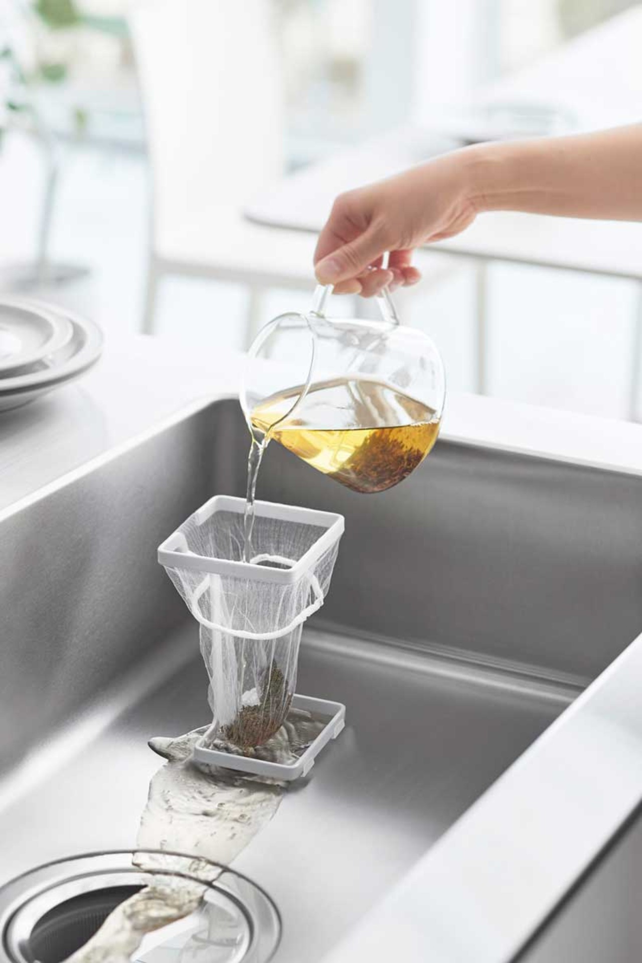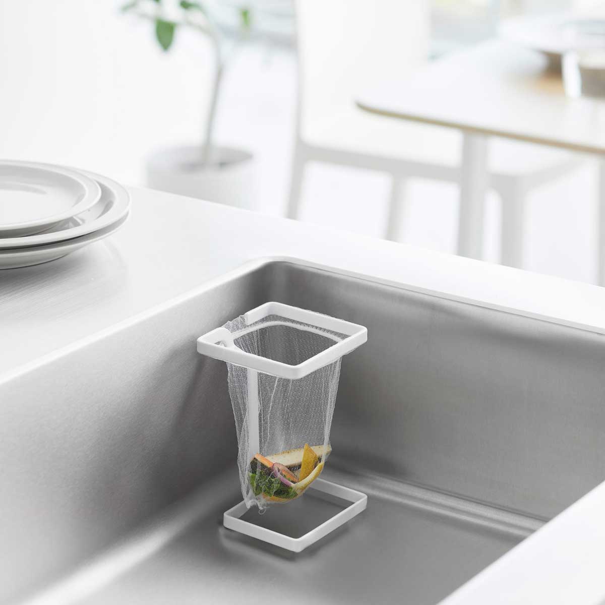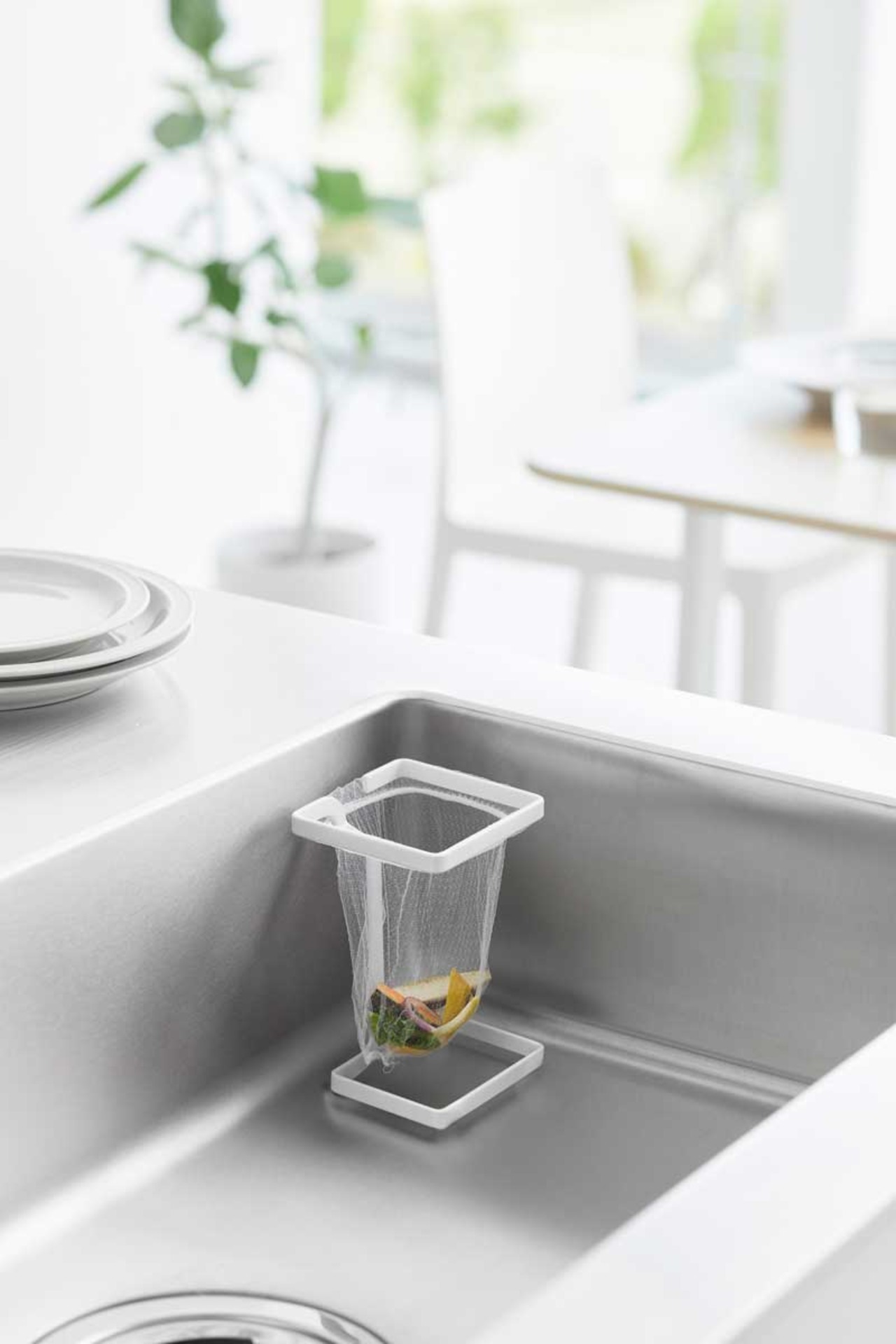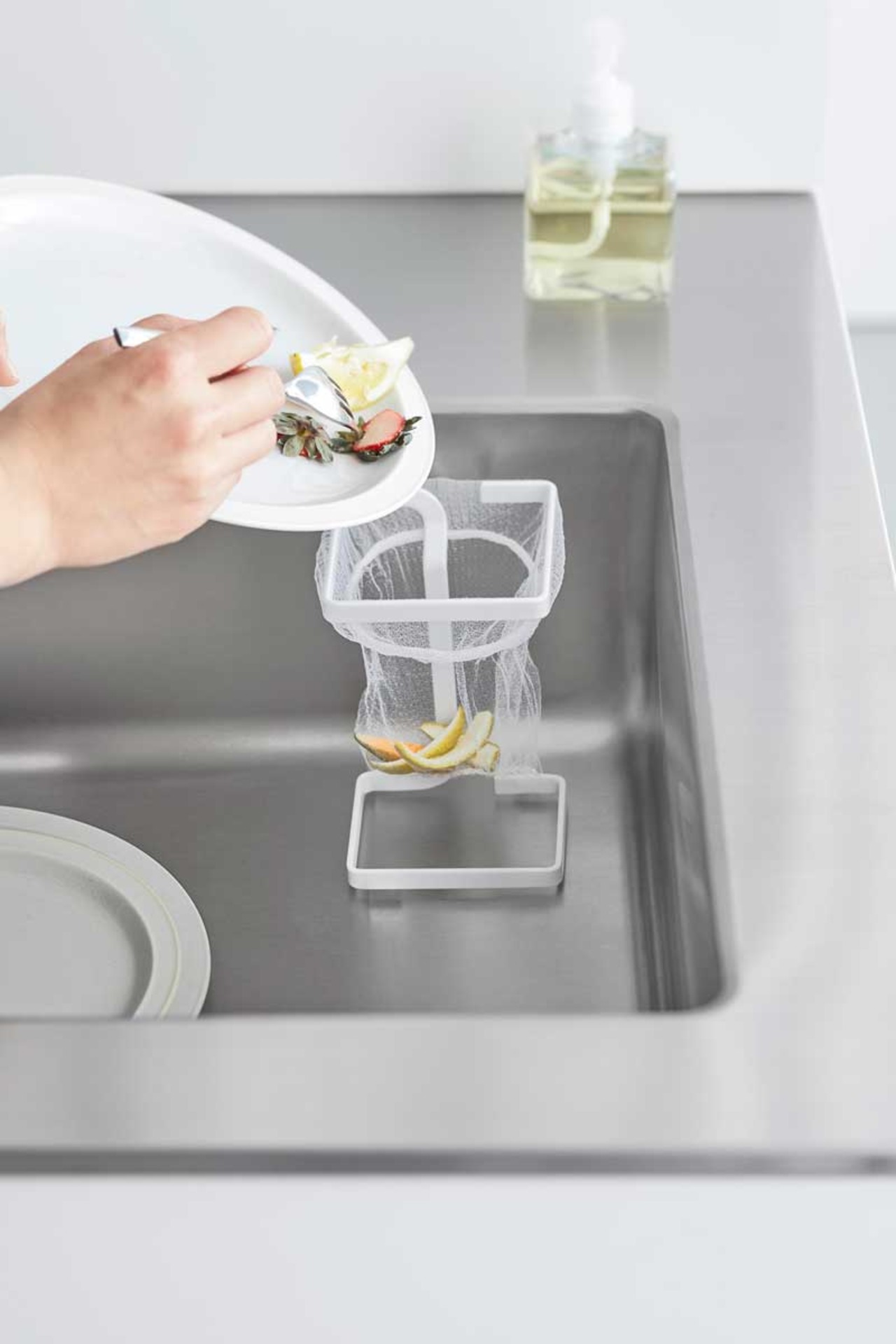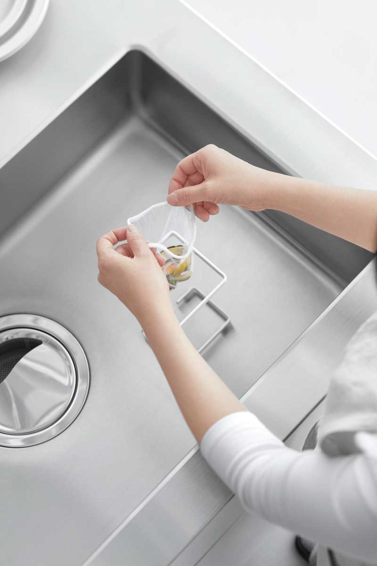 お手持ちの水切りネットを引っ掛けるだけで簡単にセットできます。付属のクッションを付ければ、シンクにキズがついたり汚れが溜まるのを防止できます。