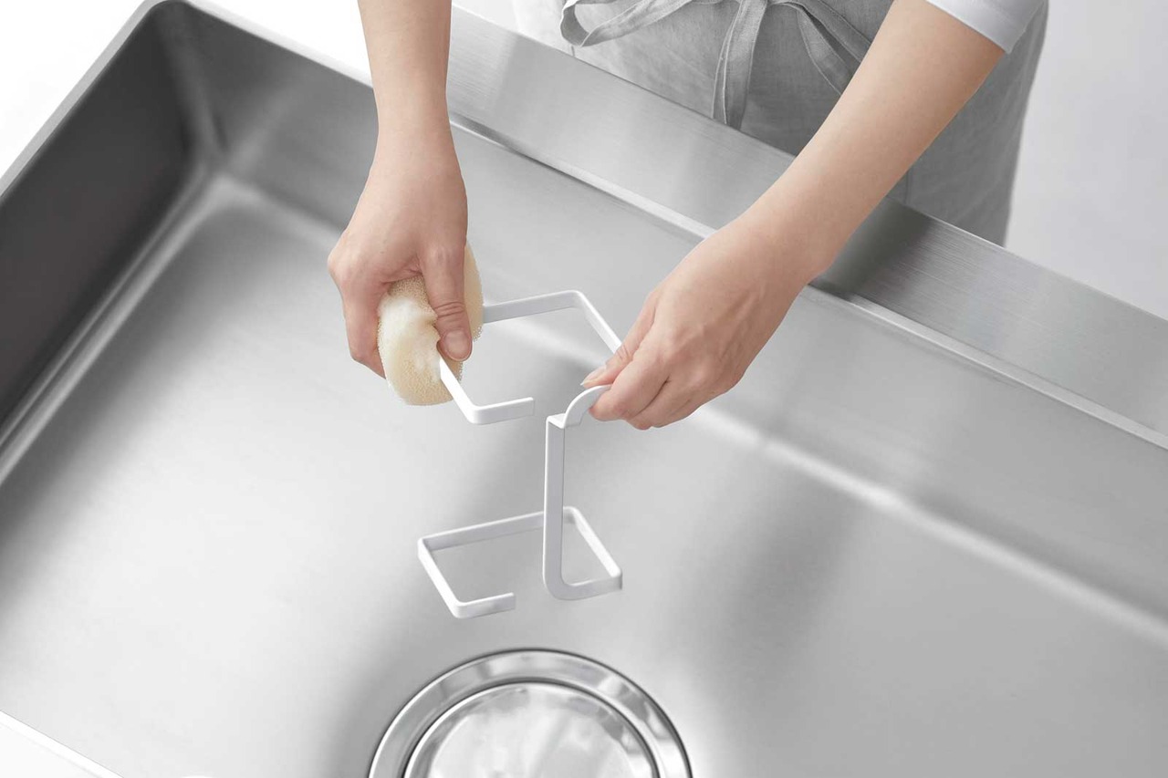 シンクのコーナースペースを無駄なく活用できる、スチール製の水切りネット用ホルダーです。狭いキッチンシンクでも置き場所に困らないコンパクトサイズ。