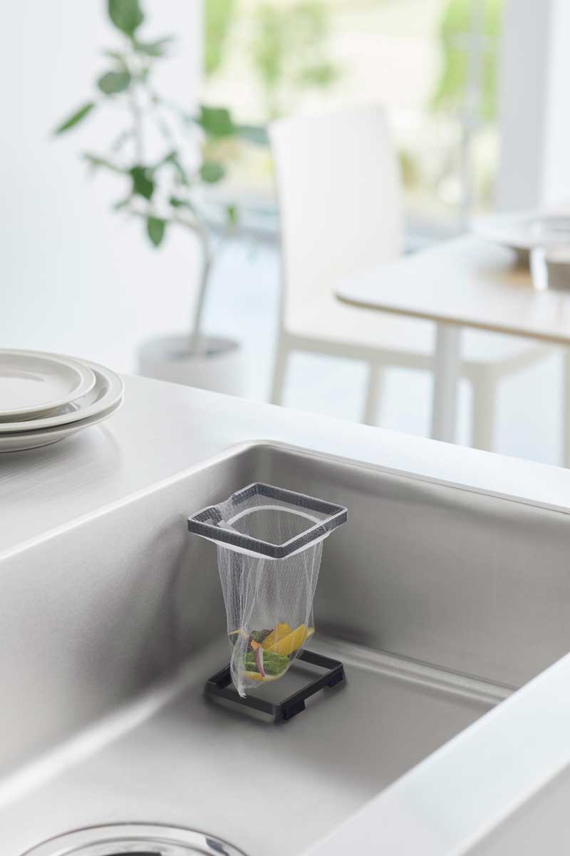 お手持ちの水切りネットを引っ掛けるだけで簡単にセットできます。付属のクッションを付ければ、シンクにキズがついたり汚れが溜まるのを防止できます。