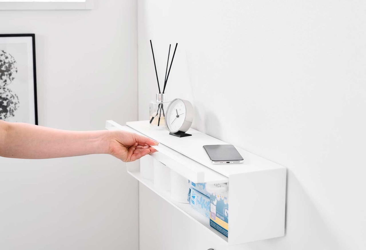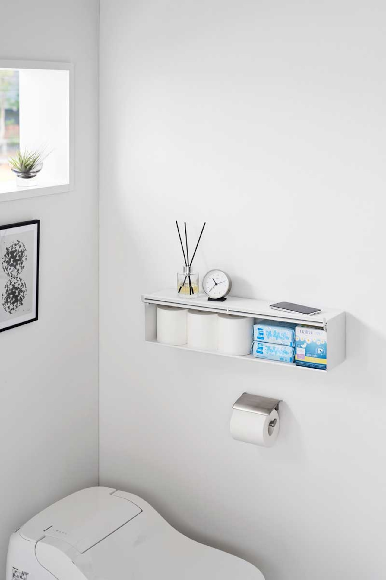 トイレ用品などのストックをスッキリ隠して収納、石こうボードピンでお好みの位置に取り付け可能な収納棚です。石こうボードピンの他に、木ネジでも取り付け可能です。