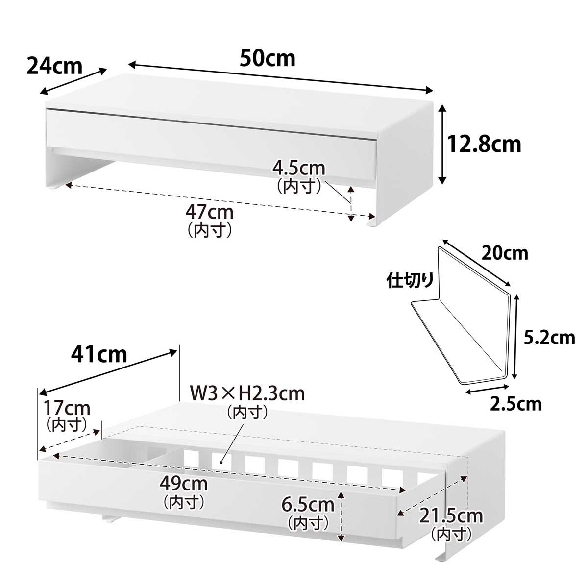 ・内寸サイズ:約W500xD240mm(天板)/約W490xD215xH65mm(引き出し有効内寸、開口部最大約D170mm)/約W30xH23mm(ケーブル通し口1か所あたり)/約W470xD240xH45mm(引き出し下)