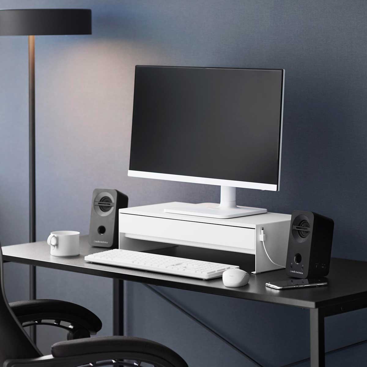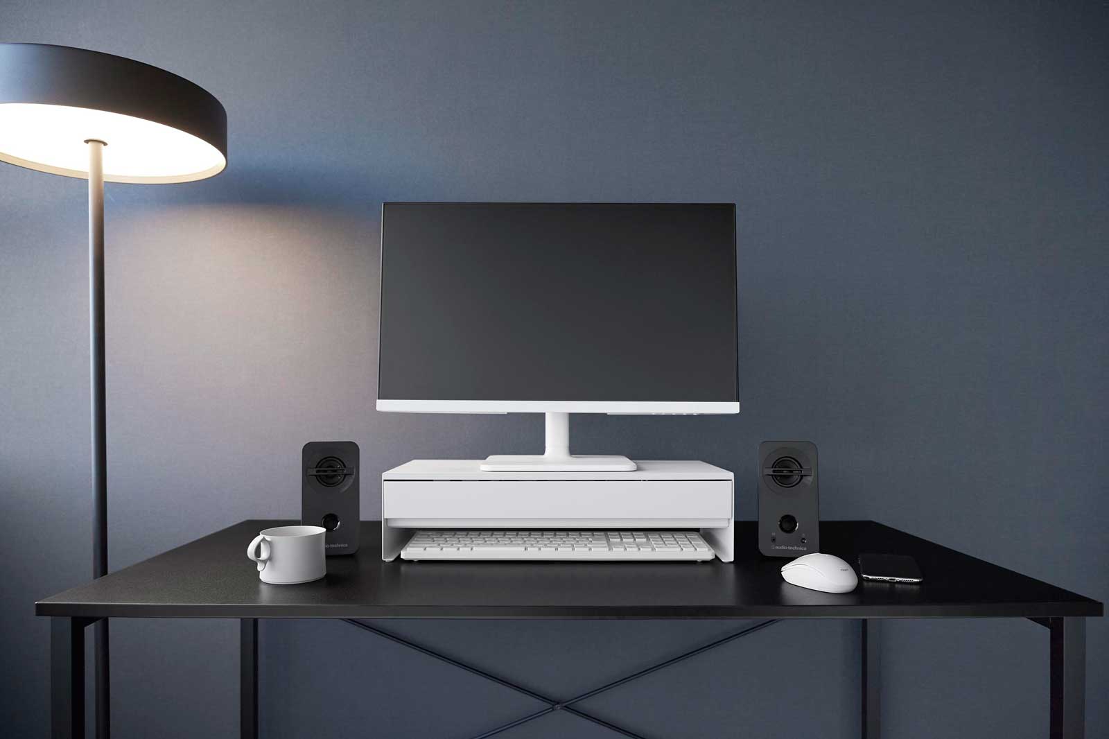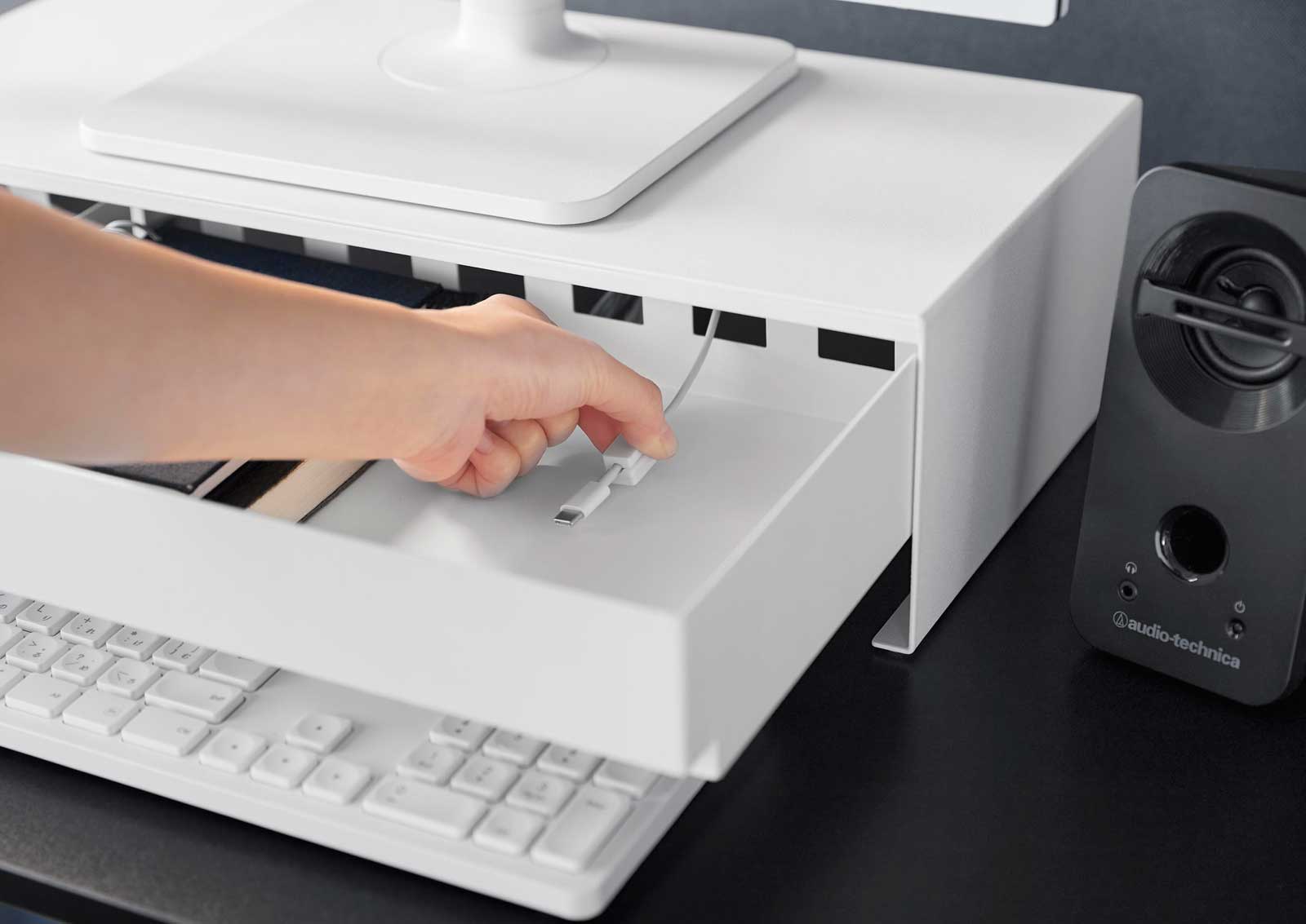 モニター下のデッドスペースを有効活用できるPCモニター台。ゲームコントローラーが入る広々設計の引き出しが付いたモニター台です。引き出し内には、可動式のマグネット付き仕切りが付いているので、整理がしやすく便利です。