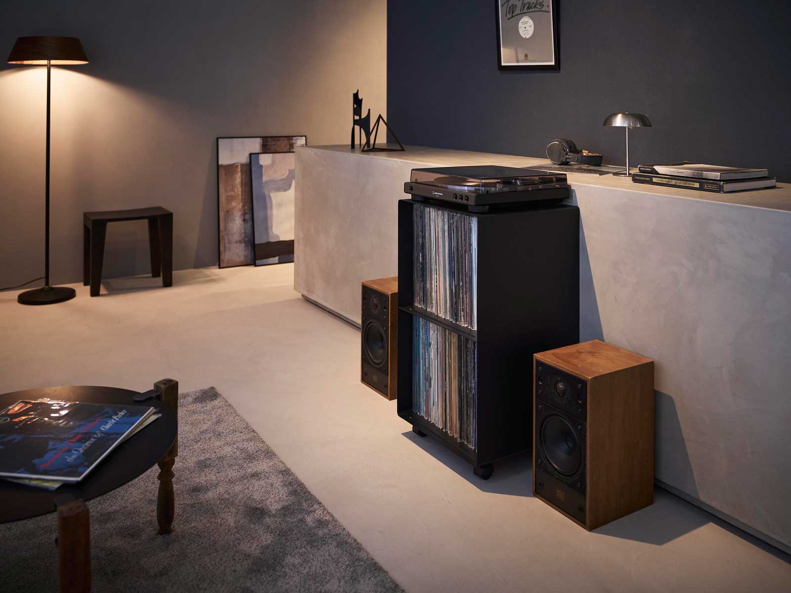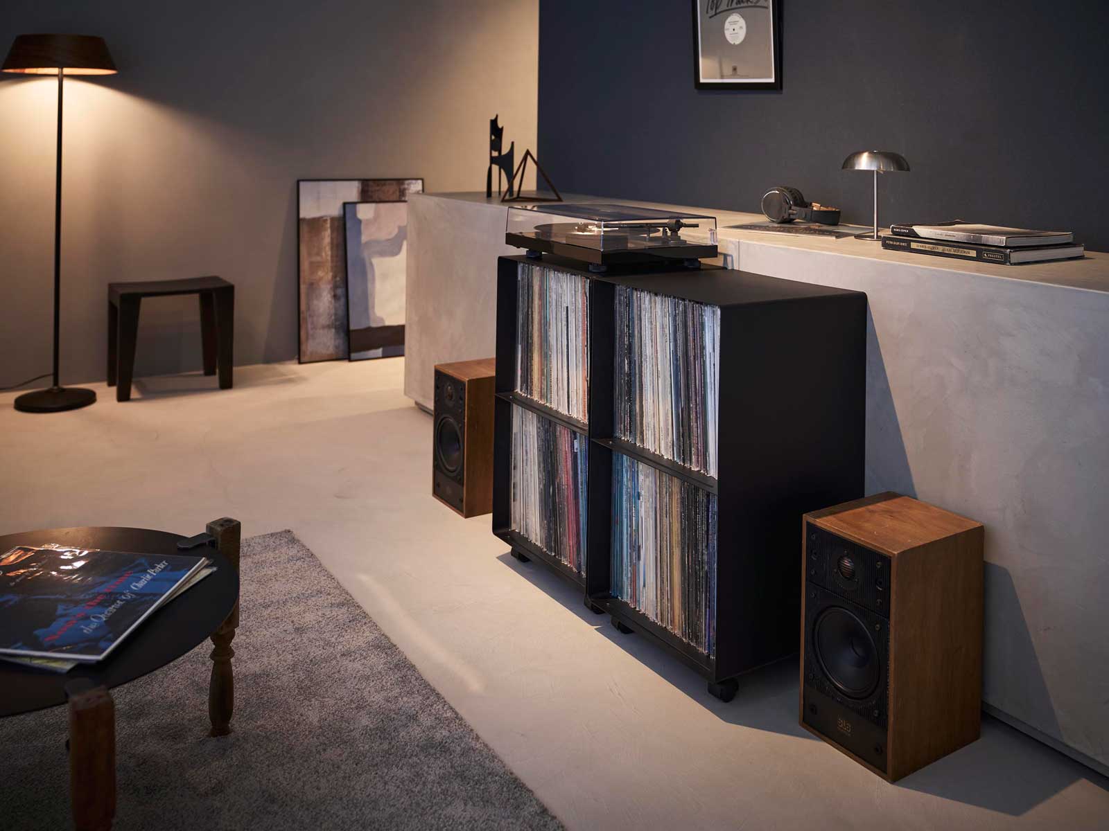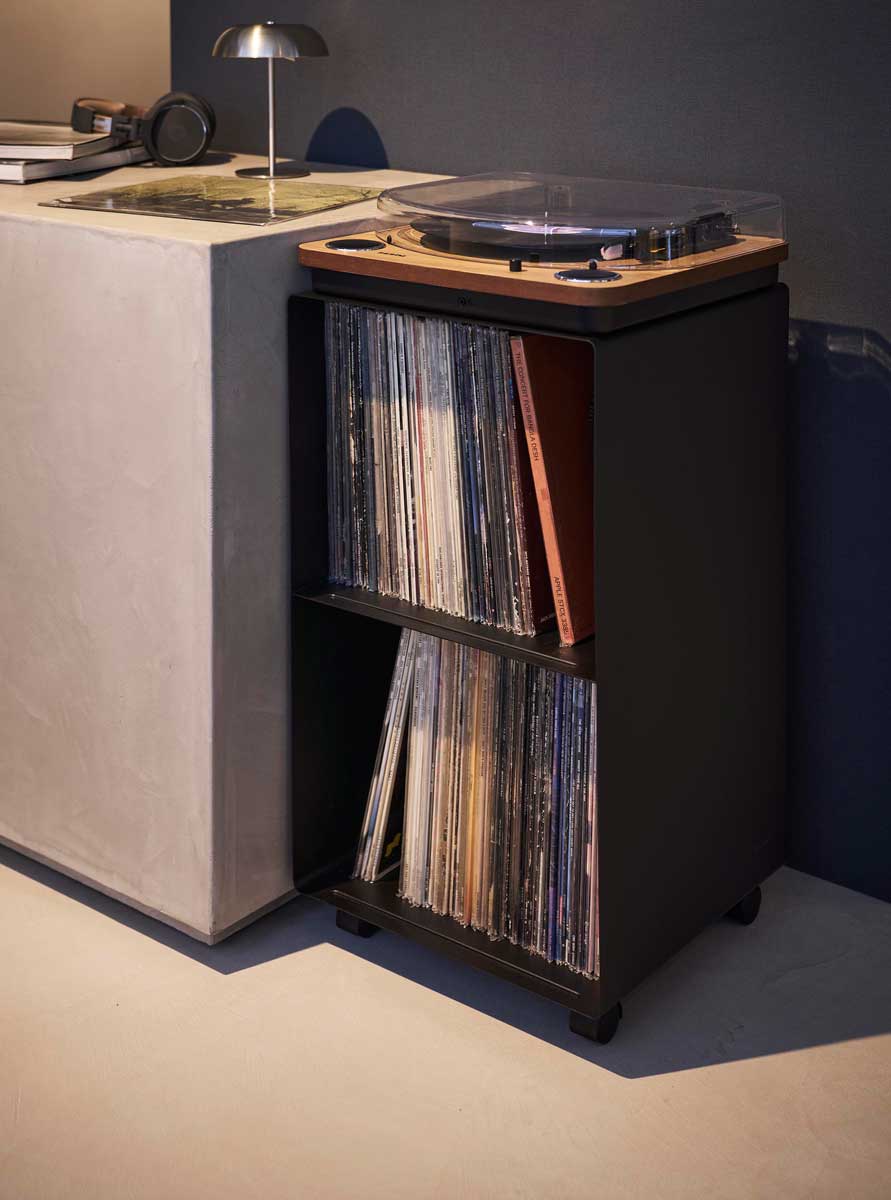 天板には幅38x奥行き38cmまでのレコードプレーヤーを設置できます。スチール製の側面には、別売りのマグネット収納が取り付け可能なので、お手入れアイテムの収納場所として活用できて便利です。