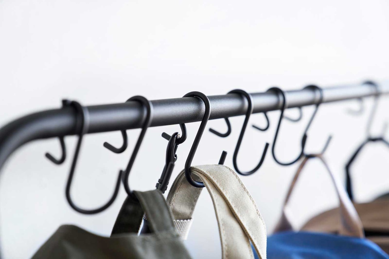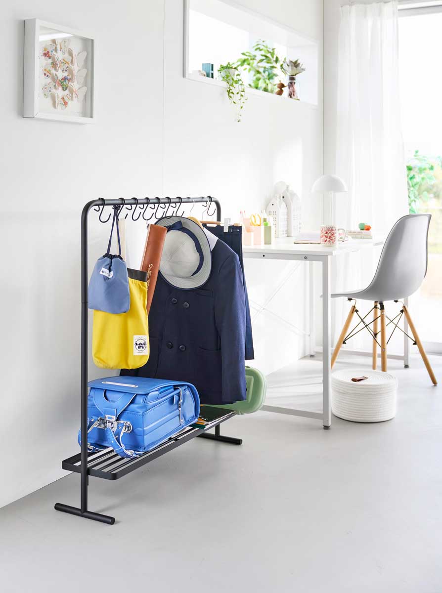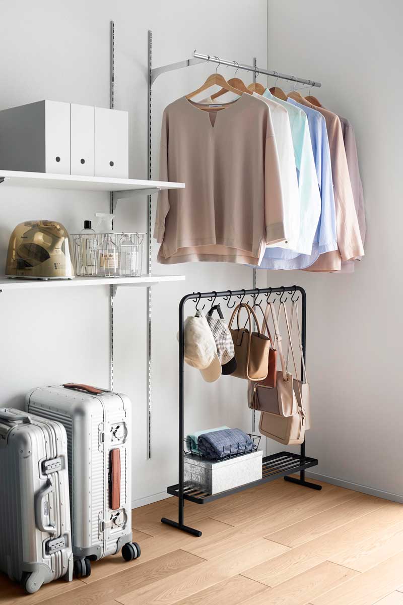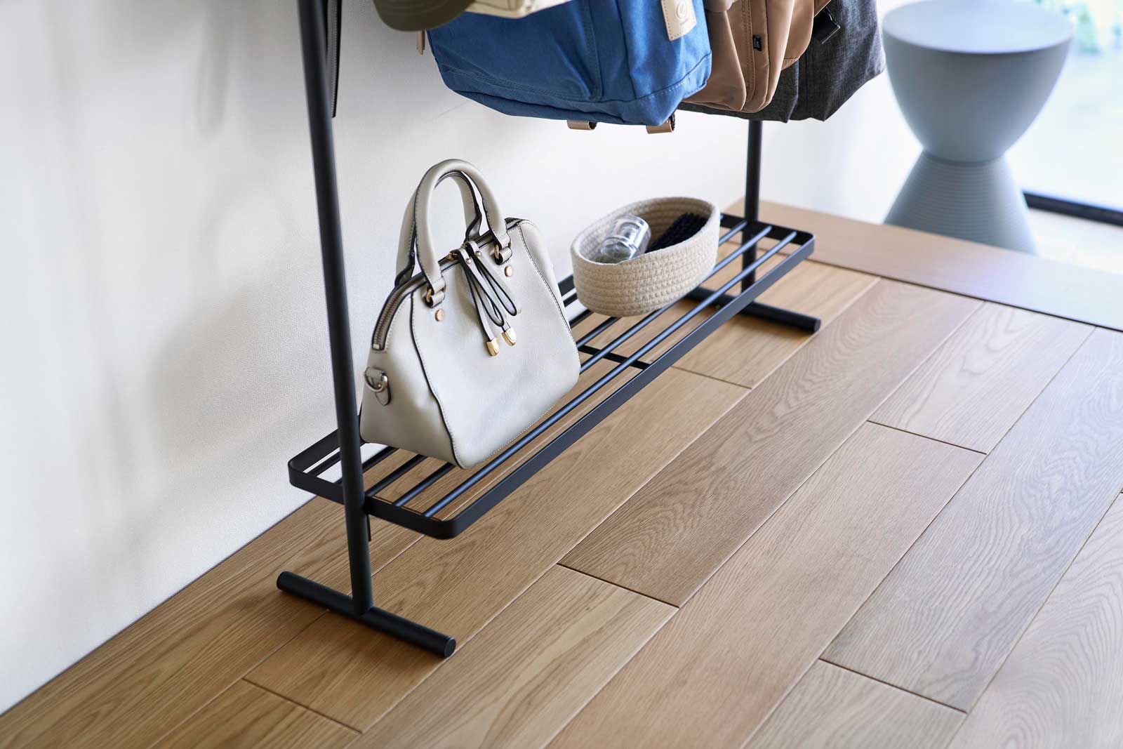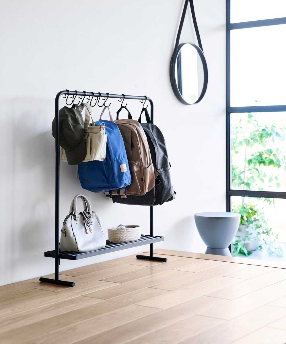 かさばって収納場所に困るバッグをすっきり整頓できる収納ラックです。バッグ以外の小物収納にも便利で、ラックには外れにくい構造のフックが8個付いています。棚下はロボット掃除機が通れる高さがあり、お掃除もスムーズです。