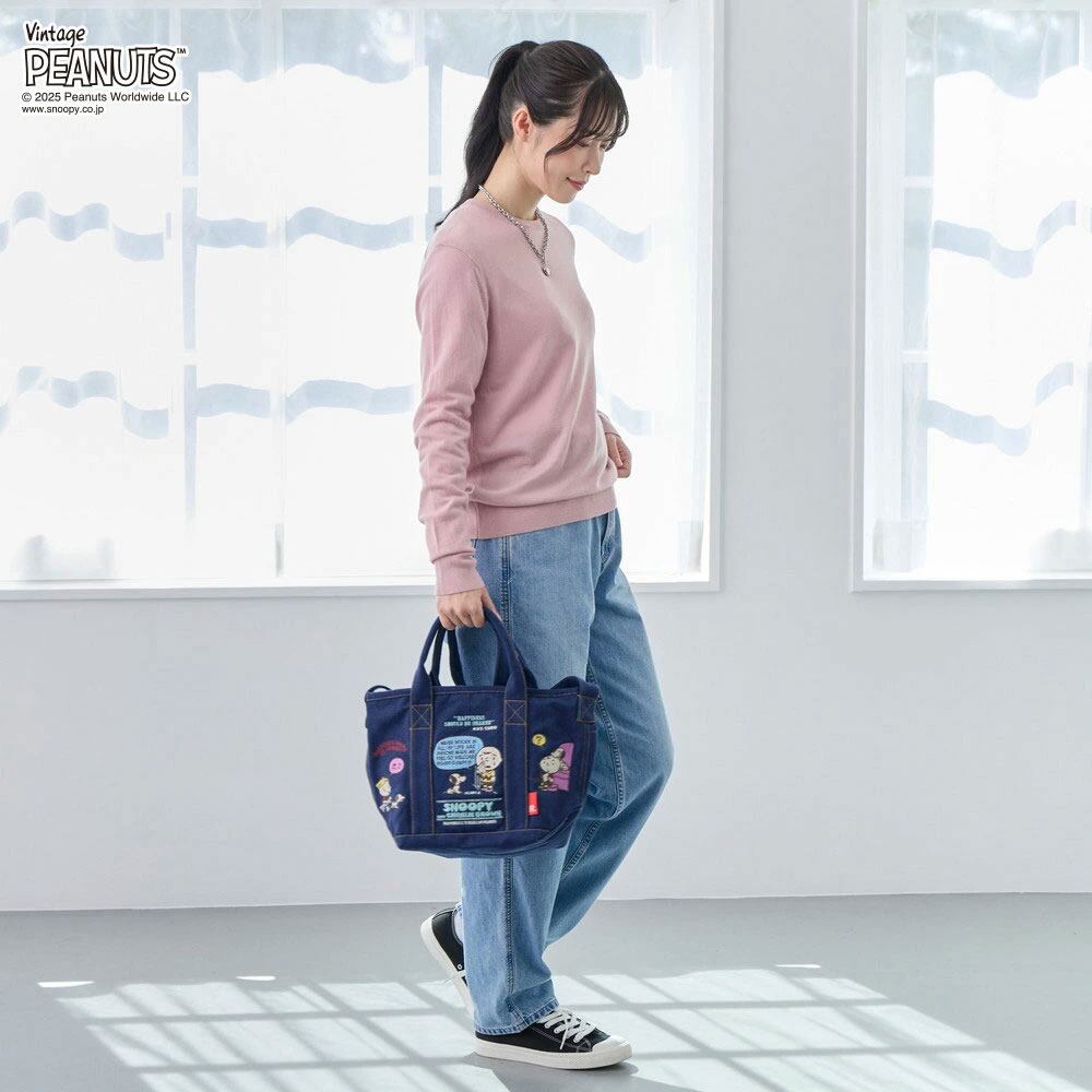 オトナも楽しんでいただけるこだわりのデザイン。表情豊かなスヌーピーと仲間たちを、カラフルな刺繍で表現。縦糸と横糸の色を変えることで、デニムの風合いに仕立てたリサイクルコットン生地を使用。背面のルーポケットは、すぐに取り出したい小物の収納に便利です。広めの底マチで、見た目以上にたっぷり収納可能。