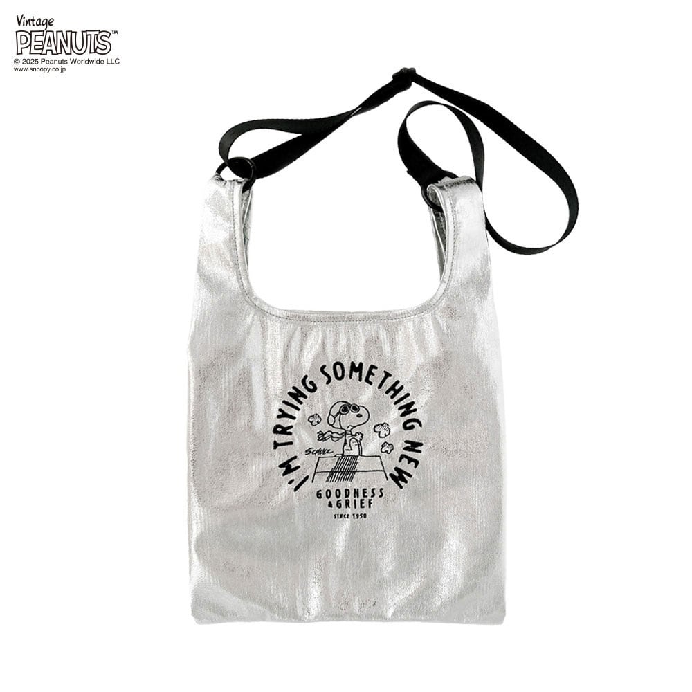 PEANUTSコミック誕生75周年アニバーサリーデザインがROOTOTEに。薄手で軽い、クラック調のメタリック素材を使用。ショッパー型デザインが可愛い、トートバッグ&ショルダーバッグの2way仕様。長財布、スマホ、ボトル、A5ノート、ポーチなどが収まります。