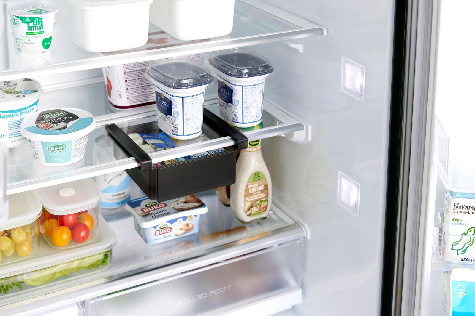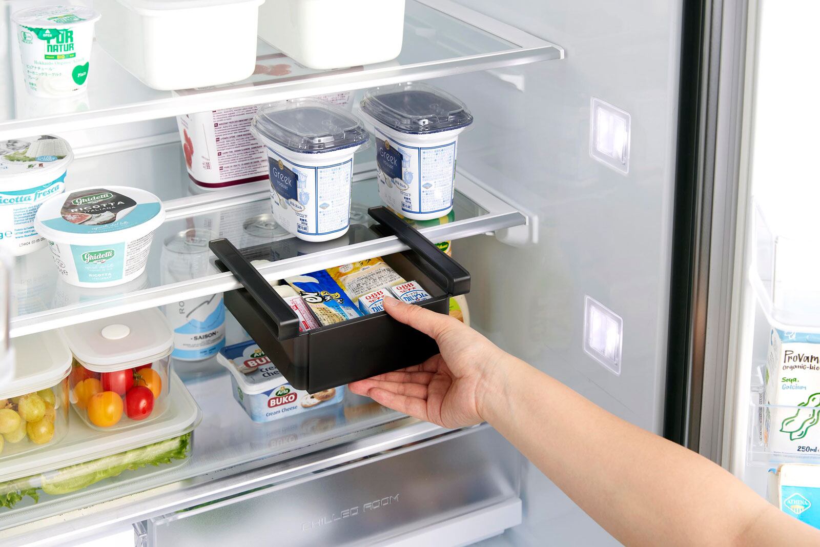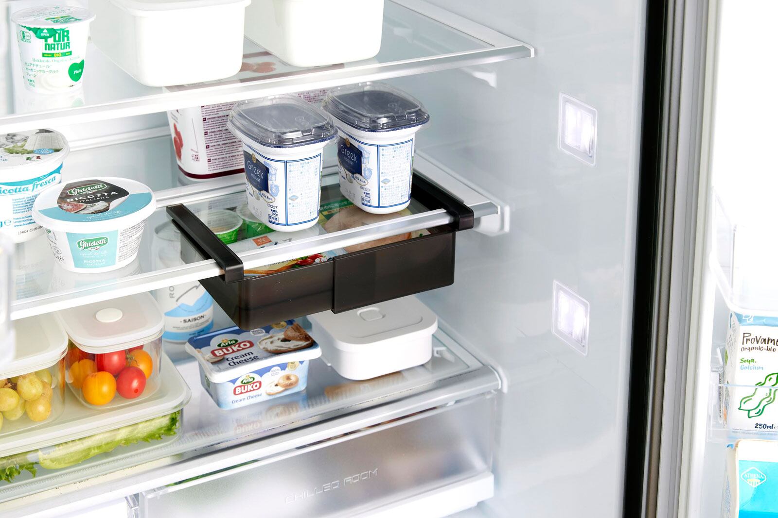 スムーズに引き出せる、冷蔵庫内の棚下を活用して収納できる伸縮式ラック。ハムやチーズなどの食品をまとめて収納できるラックです。