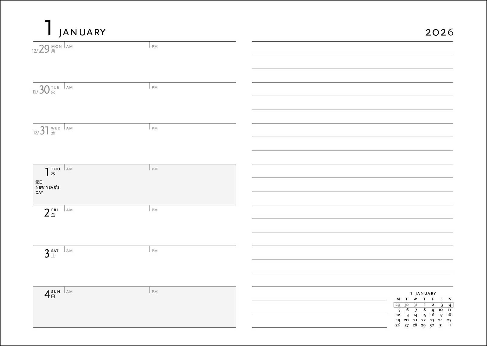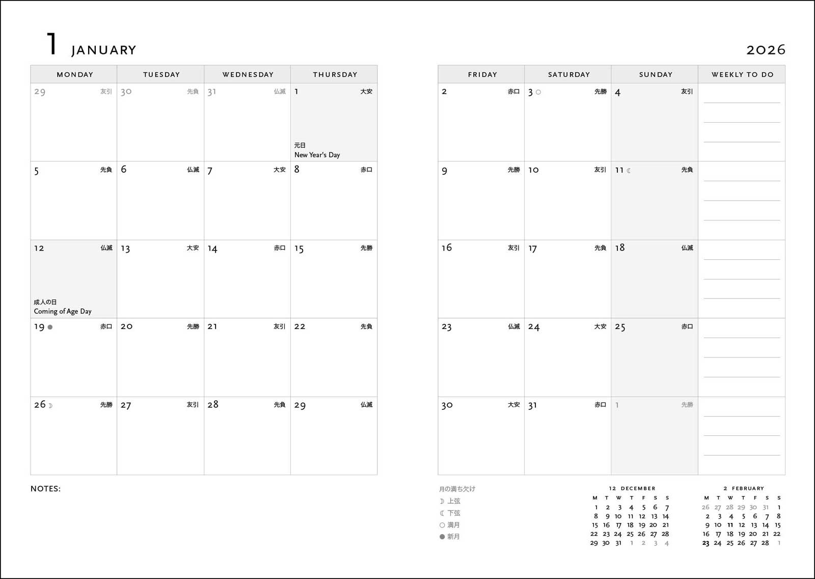 ・その他:日本の祝日、六曜、月齢などが日本語で掲載された日本仕様となっています。