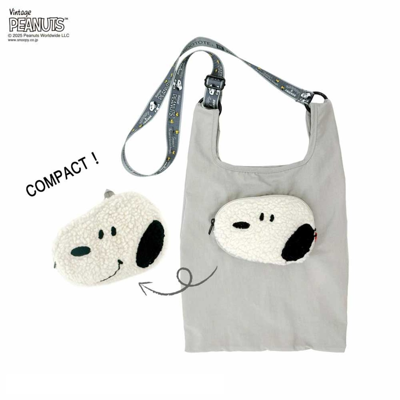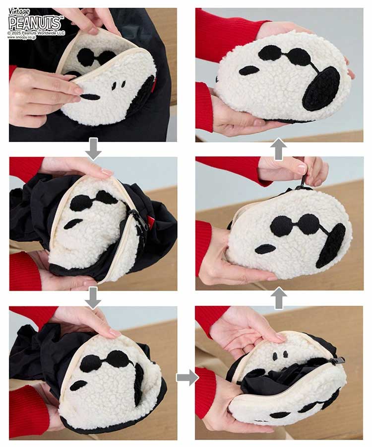 取り外し&長さ調整可能な、両面プリントのショルダーベルト付き。シーンに合わせて、手持ち・肩掛け・斜め掛けと使い分けができます。真ん中のおすましフェイスのポケットがかわいく、使わないときは、このポケットをひっくり返してショッパー本体を収納すれば、違う表情のスヌーピーに大変身。