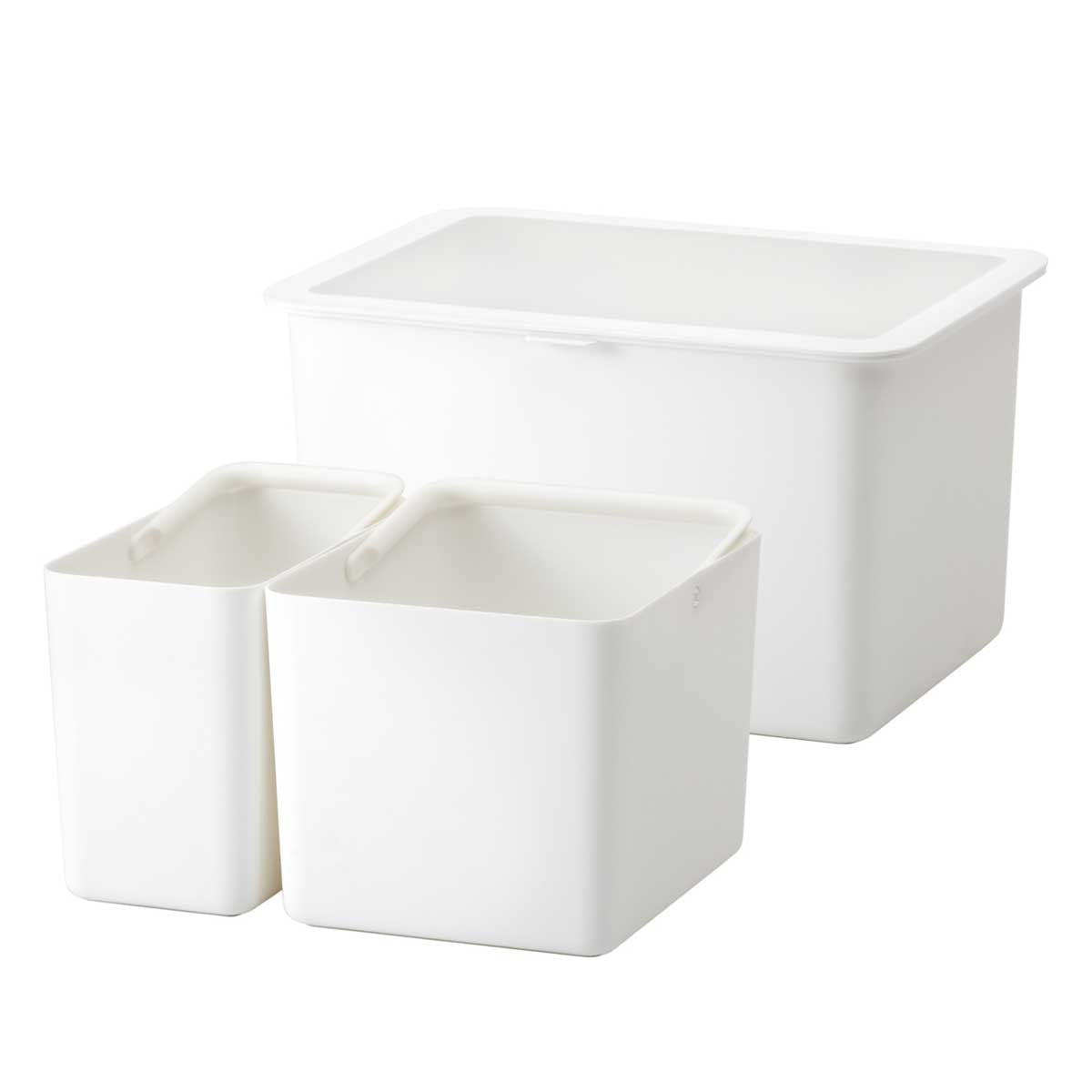 お米をすっきり効率的に収納するケースです。ケース単体でも、インナーで内側を仕切っても使える米びつ。白米と雑穀米、白米とレトルト食品などを分けて保存可能。シリアルとコーヒーといった朝食セットやペット用のドライフード・缶詰などの収納にも便利です。本体に卵殻由来の天然抗菌剤を配合。雑菌の発生を抑制する効果があり、食品も安心して保存いただけます。