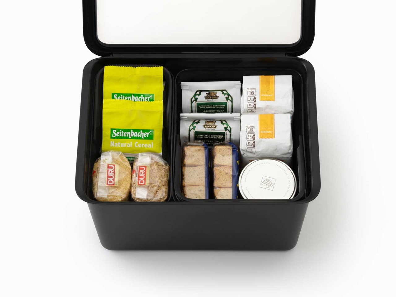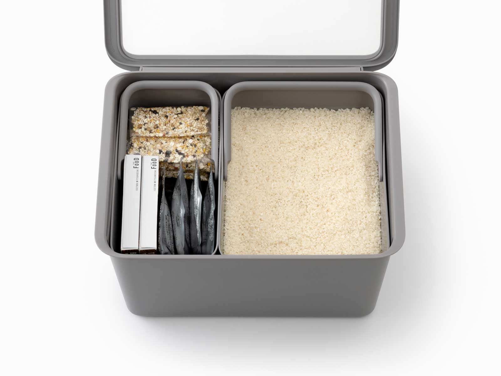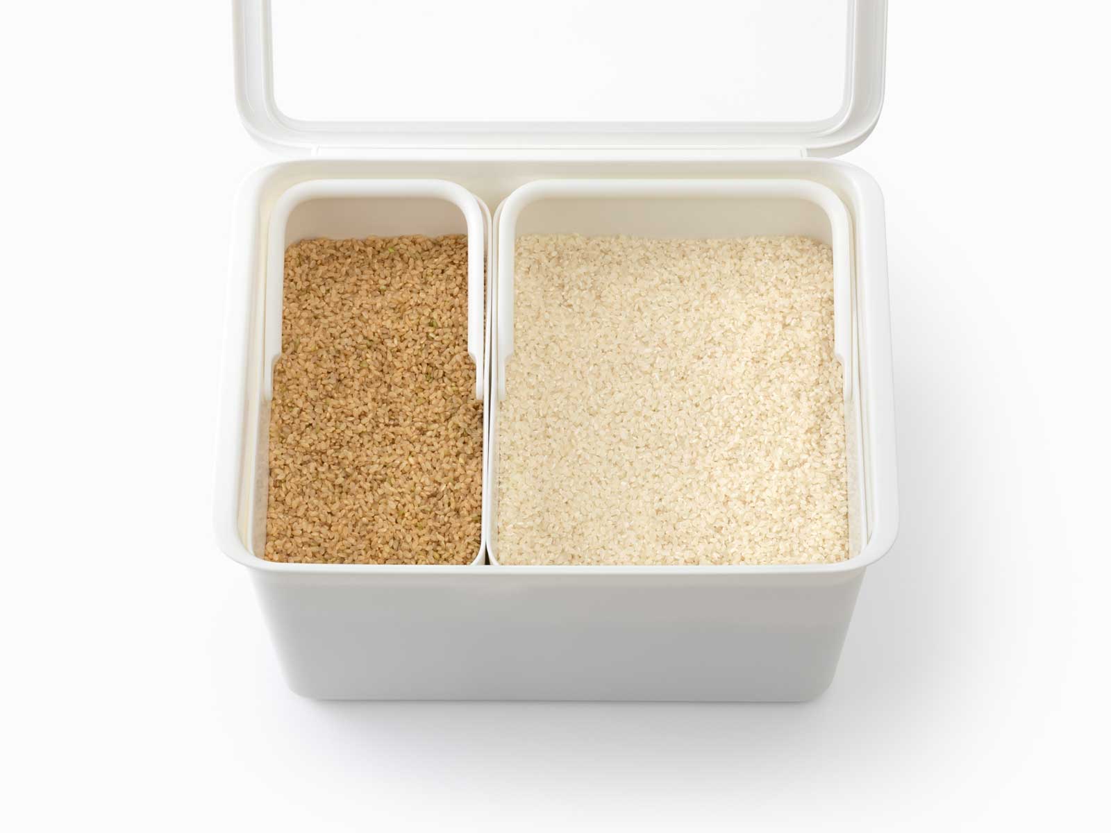 お米をすっきり効率的に収納するケースです。ケース単体でも、インナーで内側を仕切っても使える米びつ。白米と雑穀米、白米とレトルト食品などを分けて保存可能。シリアルとコーヒーといった朝食セットやペット用のドライフード・缶詰などの収納にも便利です。本体に卵殻由来の天然抗菌剤を配合。雑菌の発生を抑制する効果があり、食品も安心して保存いただけます。