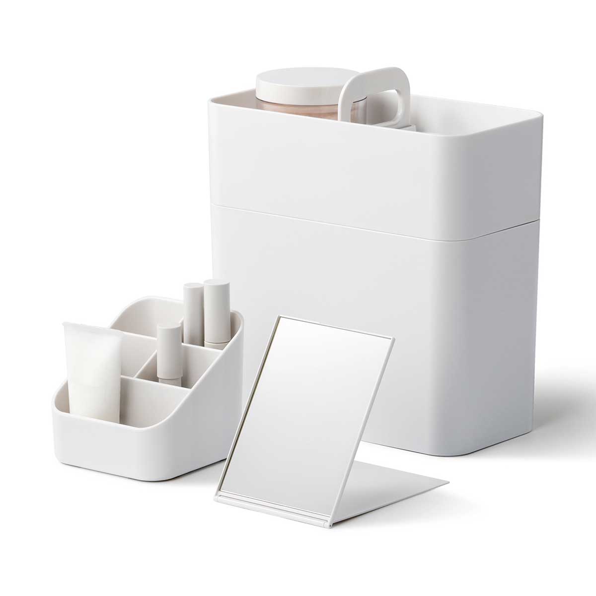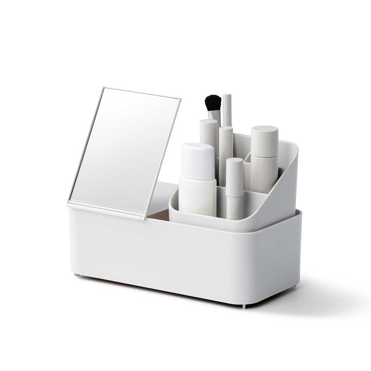 スタンドには、マスカラ・リップグロス・メイク用ブラシなどを立てて収納。トレーにはルースパウダーや小物を置くのに便利。ボックスは、高さ170mmまでの化粧品を収納可能です。付属のミラーはスタンド付きで自立させて使用することができます。