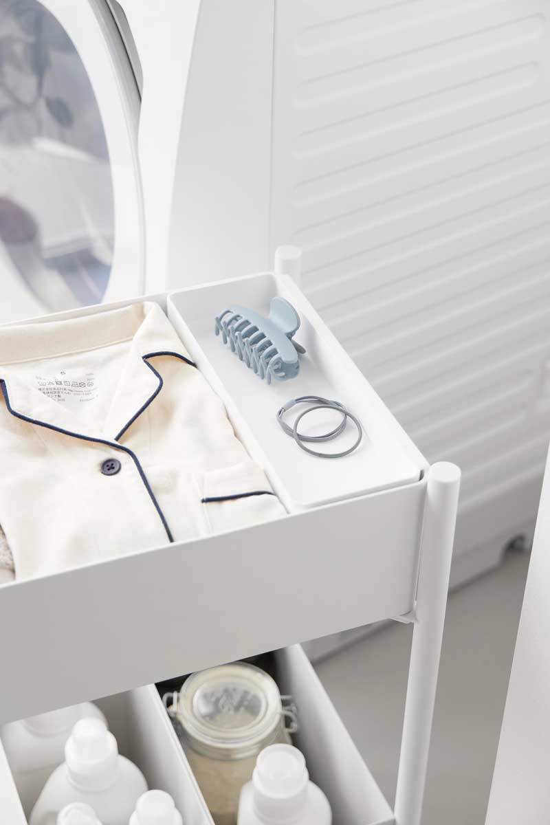 上段には衣類を、下段にはバッグを収納でき、バスケットは取り外してそのまま持ち運べます。小物トレーはアクセサリーや貴重品などの収納に便利です。