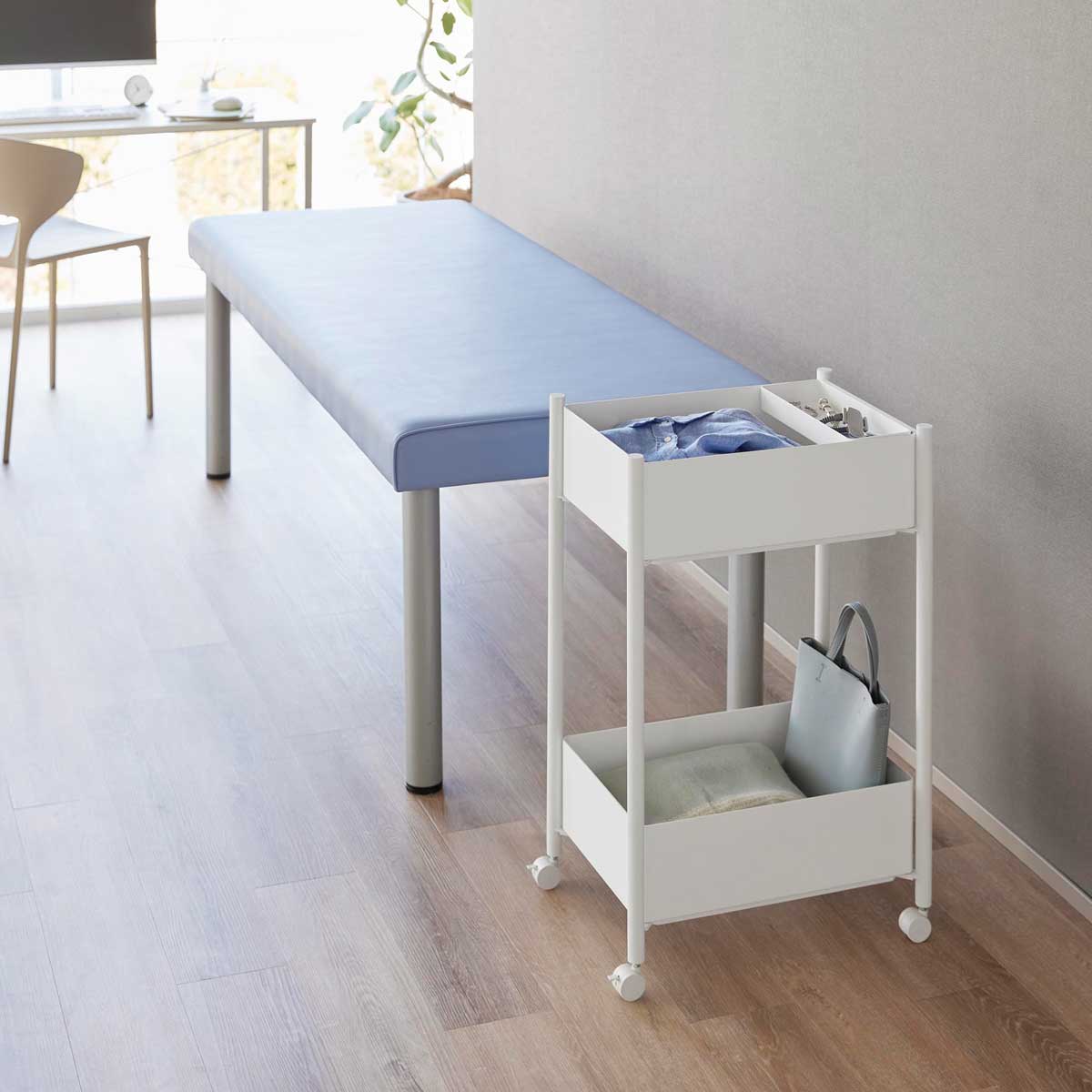 病院・エステサロンなどで便利に使える小物トレー付き収納ワゴンです。キャスター付きでスムーズに移動でき、コンパクトサイズなので診察室やカウンター周りにもスッキリと設置できます。
