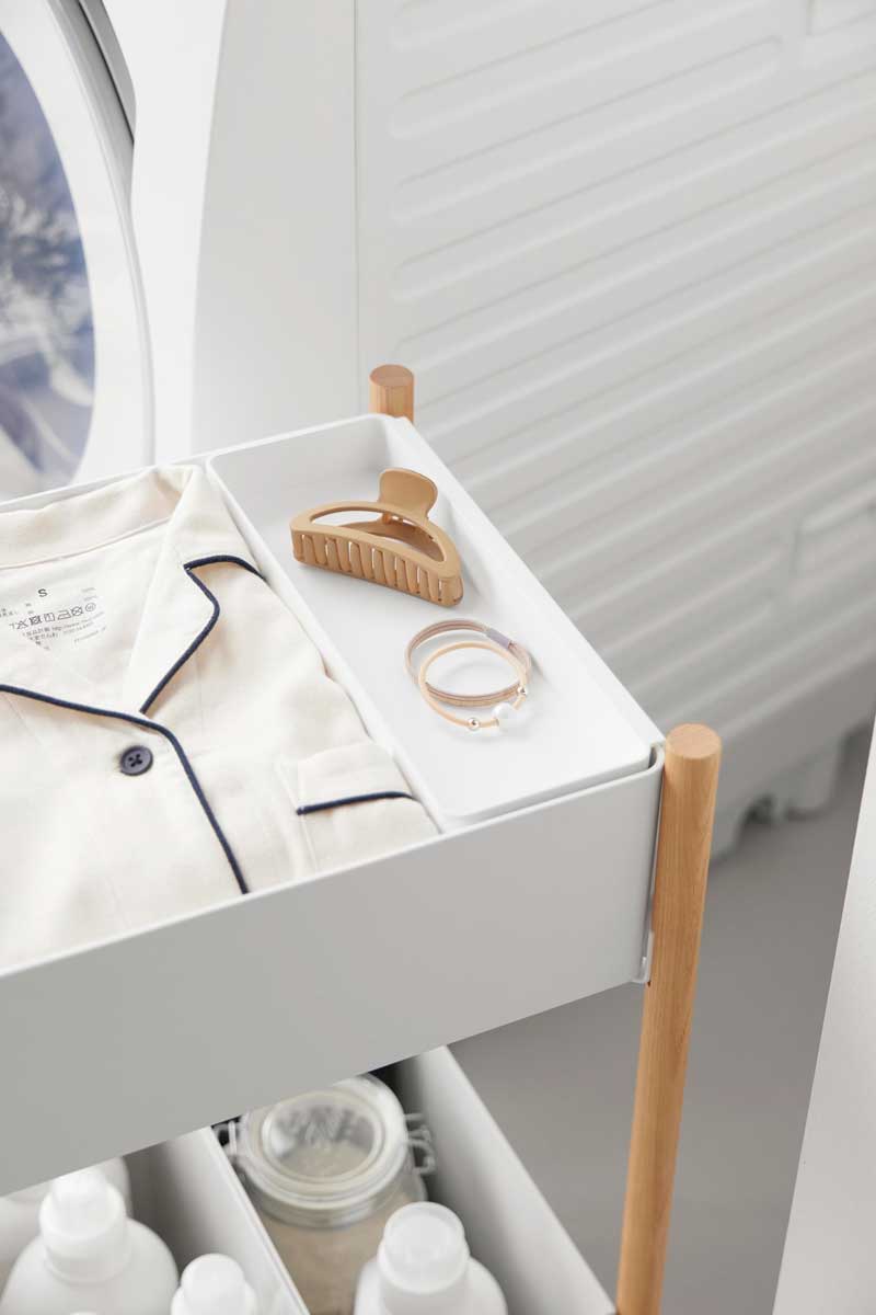 上段には衣類を、下段にはバッグを収納でき、バスケットは取り外してそのまま持ち運べます。小物トレーはアクセサリーや貴重品などの収納に便利。木との組み合わせが上品で、馴染みやすいデザインです。