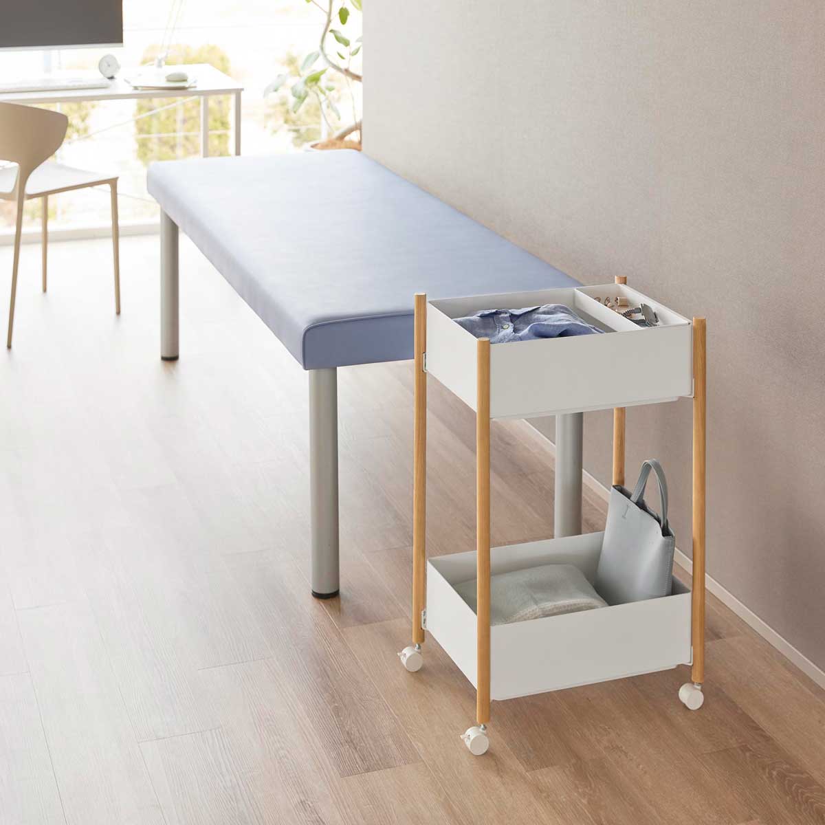 病院やエステサロンなどで便利に使える小物トレー付き収納ワゴンです。キャスター付きでスムーズに移動でき、コンパクトサイズなので、診察室やカウンター周りにもスッキリと設置できます。
