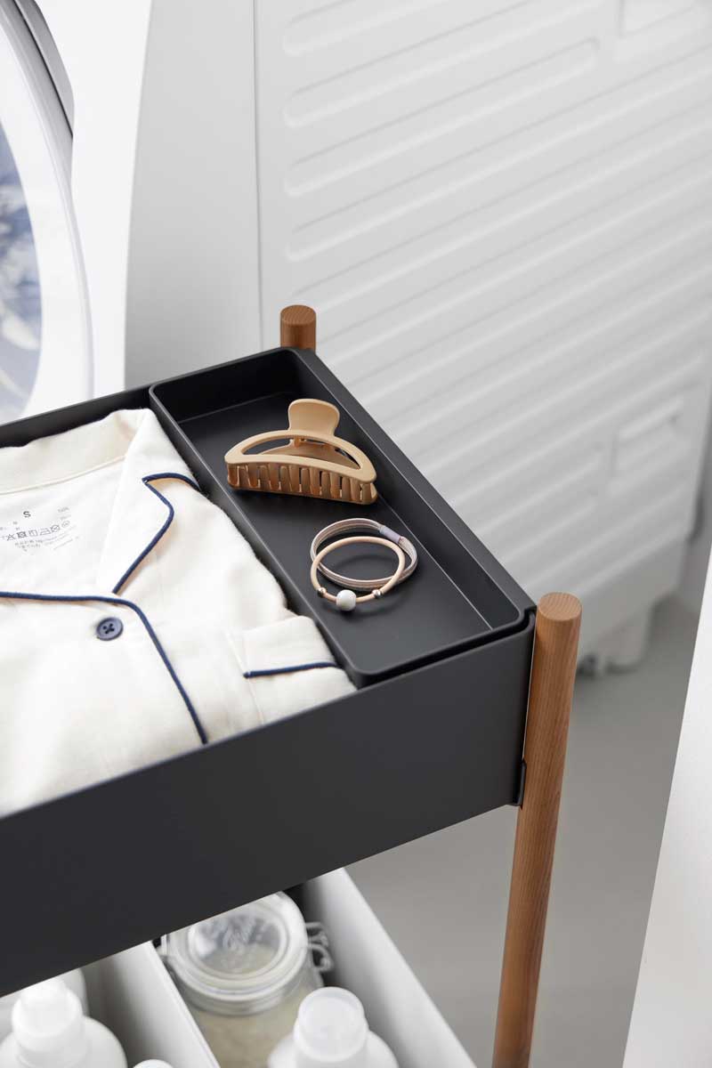 上段には衣類を、下段にはバッグを収納でき、バスケットは取り外してそのまま持ち運べます。小物トレーはアクセサリーや貴重品などの収納に便利。木との組み合わせが上品で、馴染みやすいデザインです。