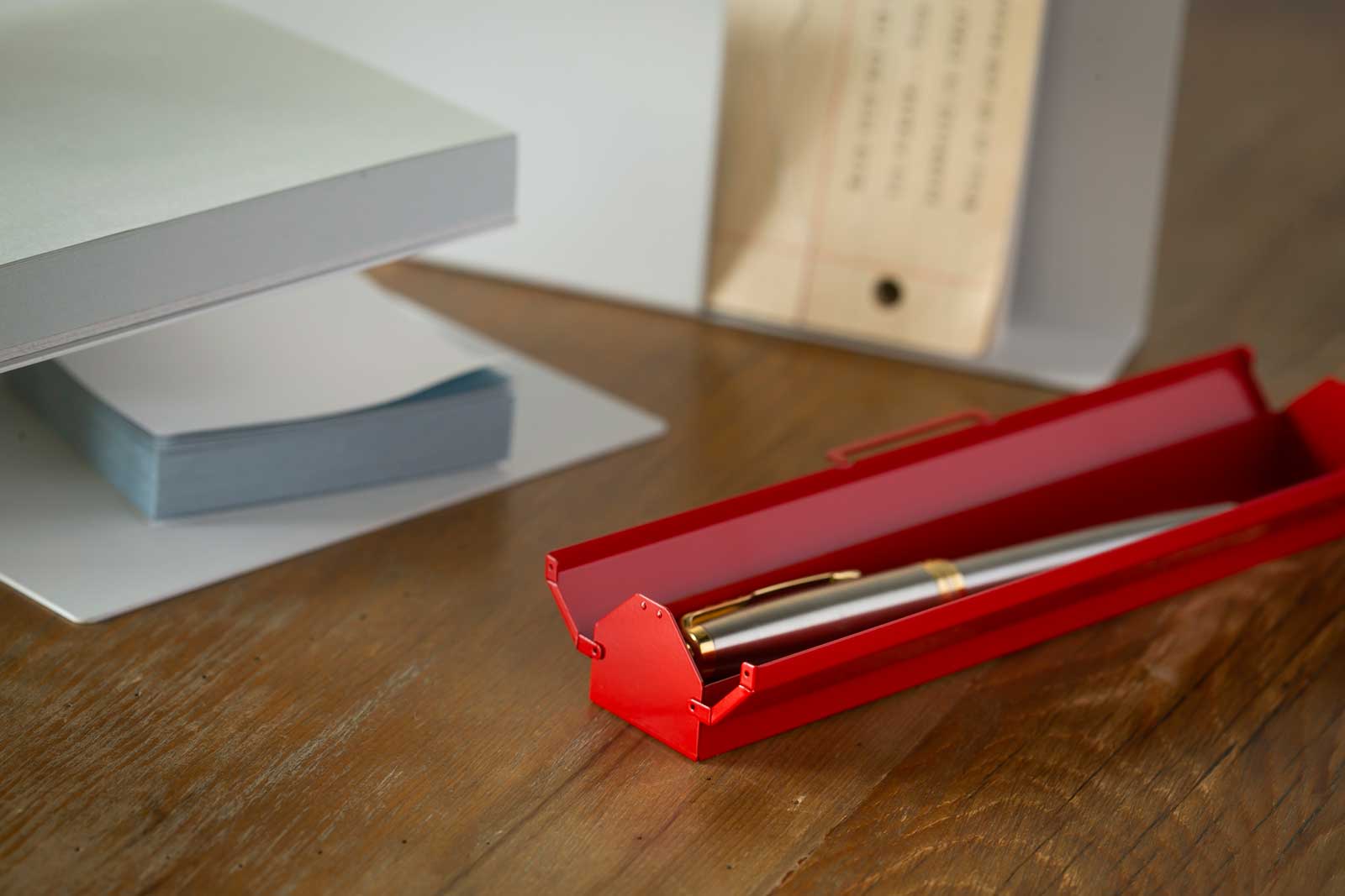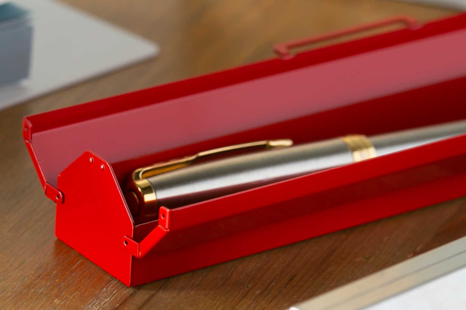 金具などパーツを一切使わずも、すべて板金のみで加工し、細部まで丁寧に組み立てられたペンケースBENDIN。昔懐かしい缶ペンケースを彷彿させる金属素材は、今も昔も変わらなく丈夫です。ペンが2〜3本ほど入るコンパクト設計のペンケースBENDINは、必要最低限の筆記具を持ち歩きたい方や、卓上での収納に最適です。