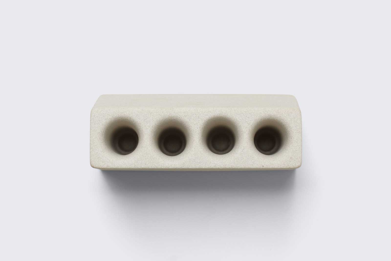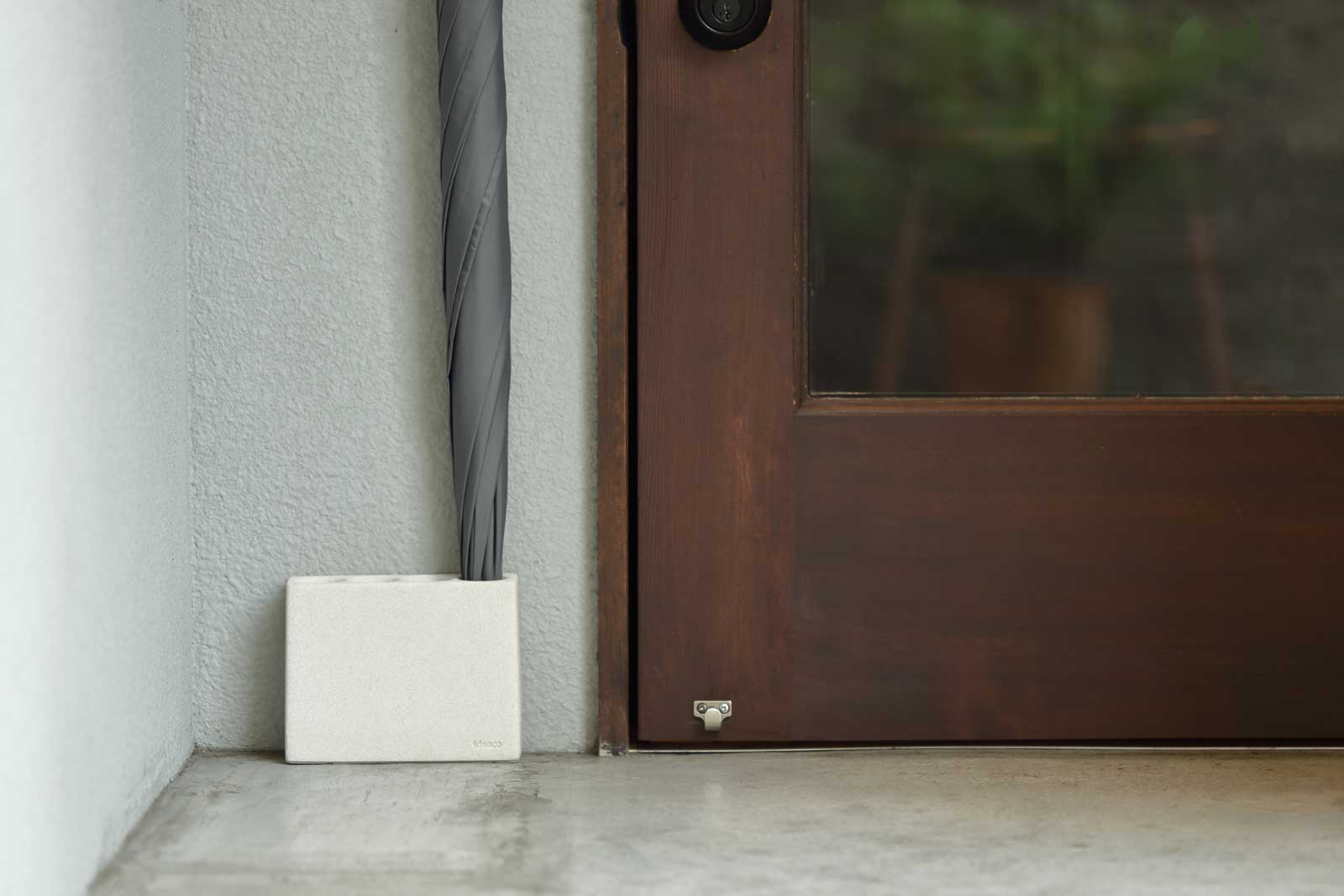 製造時CO2排出ゼロで作れる素材、環境にやさしい「POLYWARE(ポリウェア)」で作られた傘立て。ポリウェアはポリエステル樹脂の2液を混ぜることで30分ほどで固形化する特性を利用し、そこに天然石や炭酸カルシウムのパウダー状の素材を混ぜてあげることで重みのある形状を生み出しています。