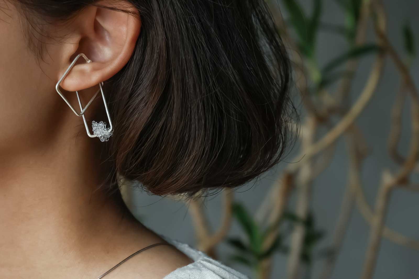 ワンポイントアクセントでその日のコーディネートをより華やかに。手作りならではの、よく見たら不均等な正方形が魅力的です。このイヤーカフはスクエア型のシルエットで顔周りをシャープに見せる個性あふれアイテムです。