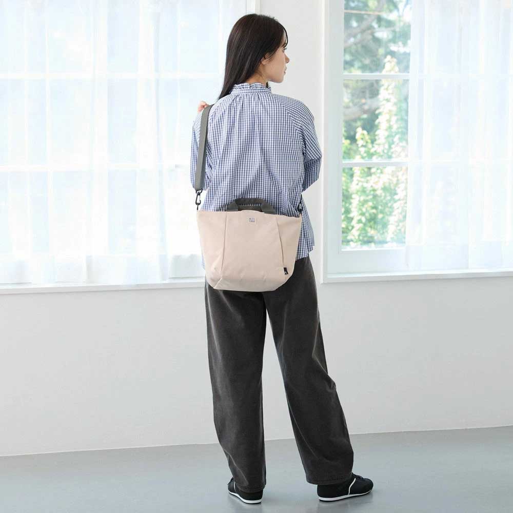 幅広マチで、ボトル、スマホ、折り畳み傘、財布、ポーチなど。必要なものがひと通り収まるので、日常のお出かけにおすすめ。開口部が広く出し入れスムーズな舟形。口元はファスナー開閉で、安心なつくりです。取り外し&長さ調節可能なショルダーベルト付で、手持ちでも斜め掛けでも、シーンに応じて使い分け。