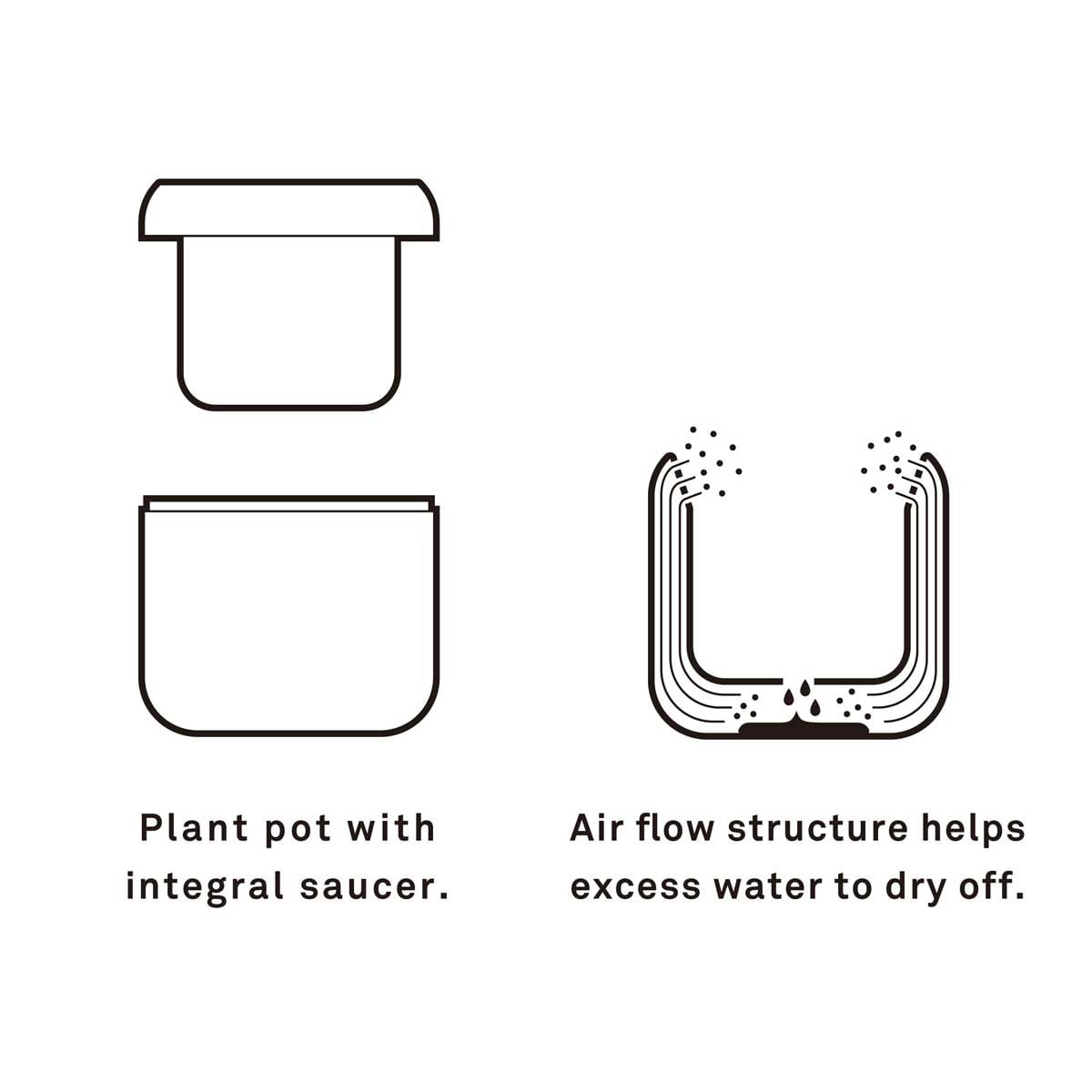 植物は茎や葉だけでなく根からも呼吸しています。プラントポット ハチは上部に施した三十三個の通風口に空気が通るので、植物の呼吸を妨げません。二層にすることで、溜まった水を簡単に捨てやすいため、根腐れを起こしにくい構造になっています。また、受け皿部分に水をためておき、鉢を少しの間浸してから水を捨てるという使い方もできます。