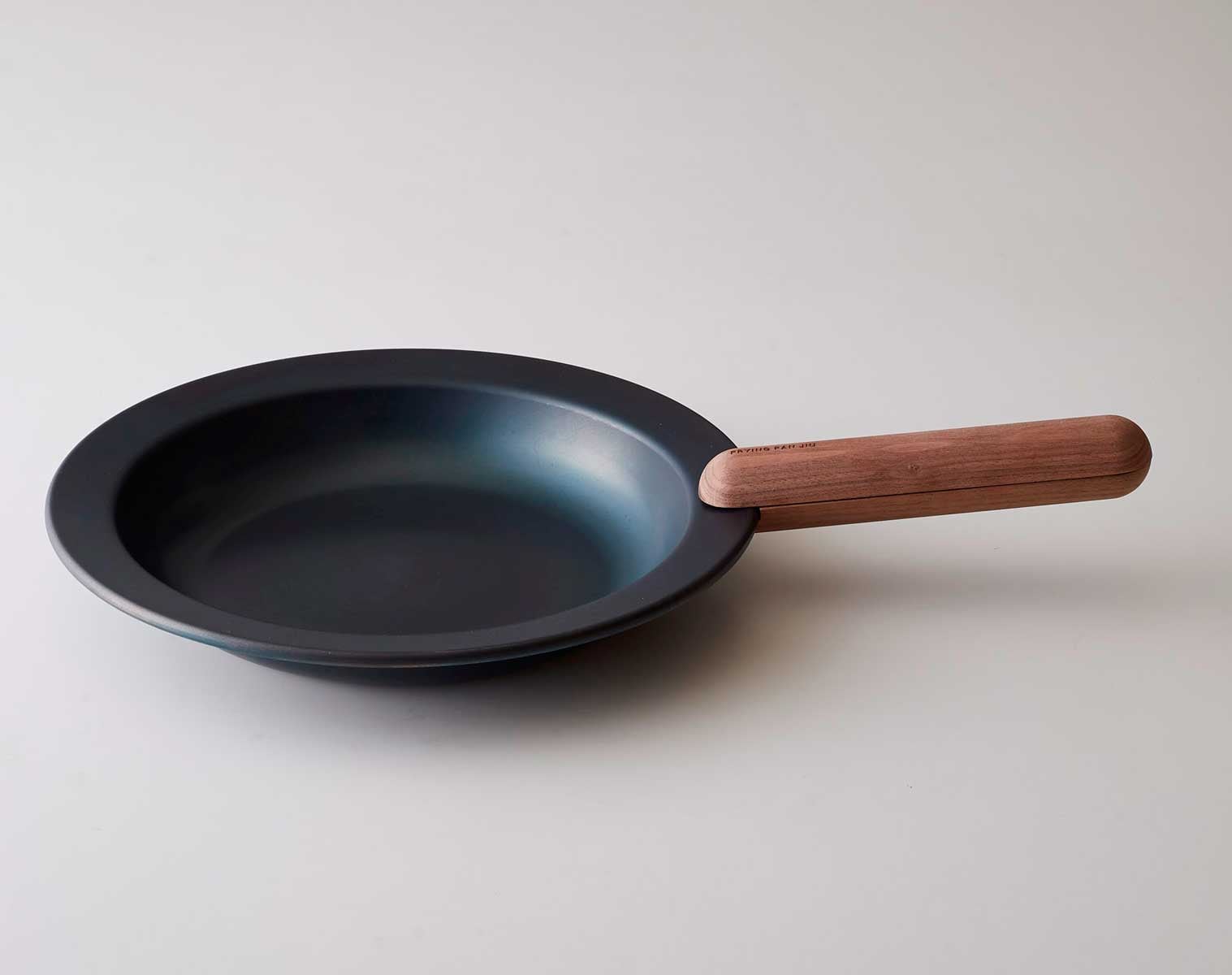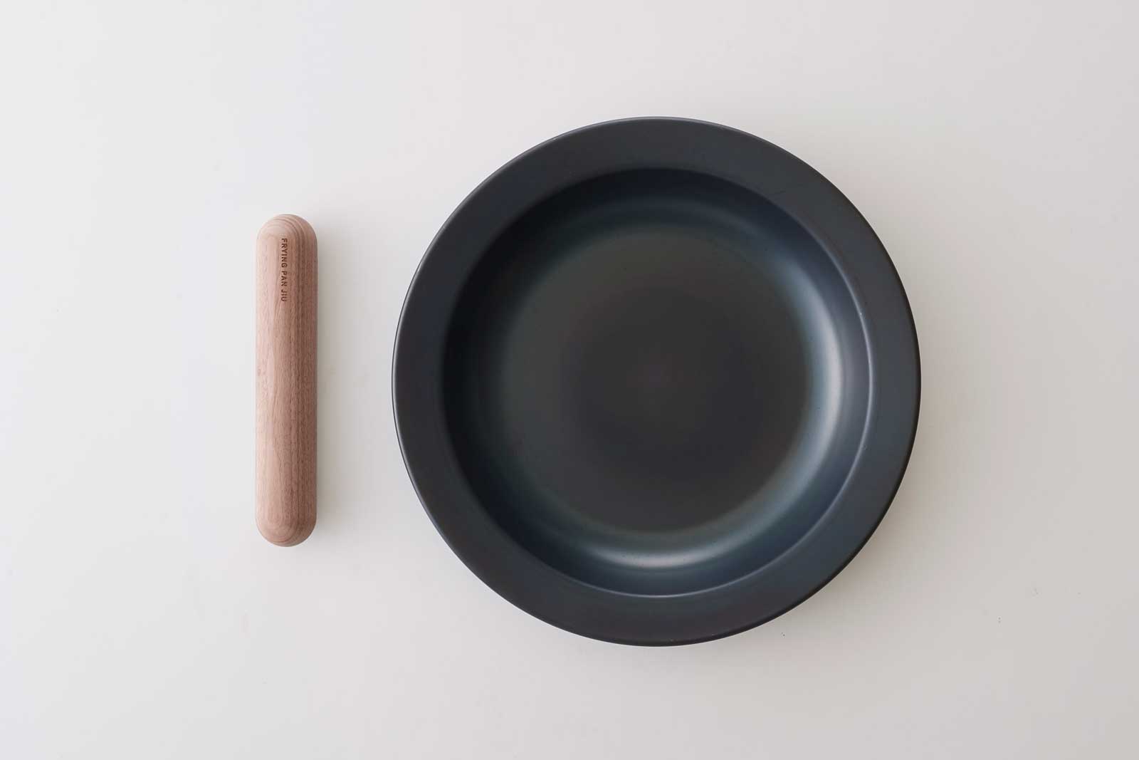 そのお皿 、実は高品質な鉄フライパンです。大阪の小さな町工場藤田金属株式会社と、東京の小さなデザイン事務所TENTが一緒に試行錯誤を繰り返し、ようやくたどり着きました。 「つくる」と「たべる」を一つにする。 町工場が作る鉄フライパン。 フライパン「ジュウ」です。鉄フライパンは大阪の町工場で1つ1つへら絞り加工を行なって製造し、ハンドルは山形県天童市の工場で、無垢の木材を削り出して作っています。ガスコンロはもちろん、IHにも対応しています。