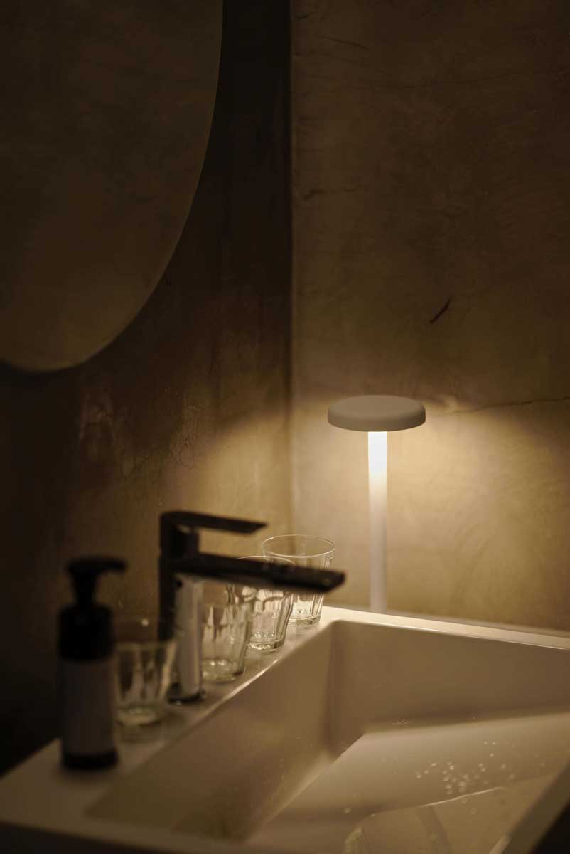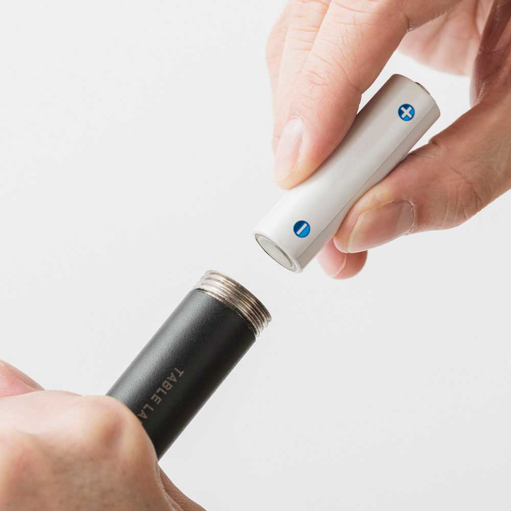 料理を美味しく肌を美しく照らす電球色のLEDを搭載。上部のユニットには、高演色(CRI 95)の暖色LEDを採用。厚みのある乳白板の奥に6灯の小さなLEDを搭載することで、電球のように優しく暖かい光を実現しました。料理はより一層美味しく、肌も綺麗に照らし出します。円柱パイプの内部に単三乾電池4本を挿入する、一切の無駄がないミニマルな設計を採用。もちろんeneloopなどの充電池にも対応。