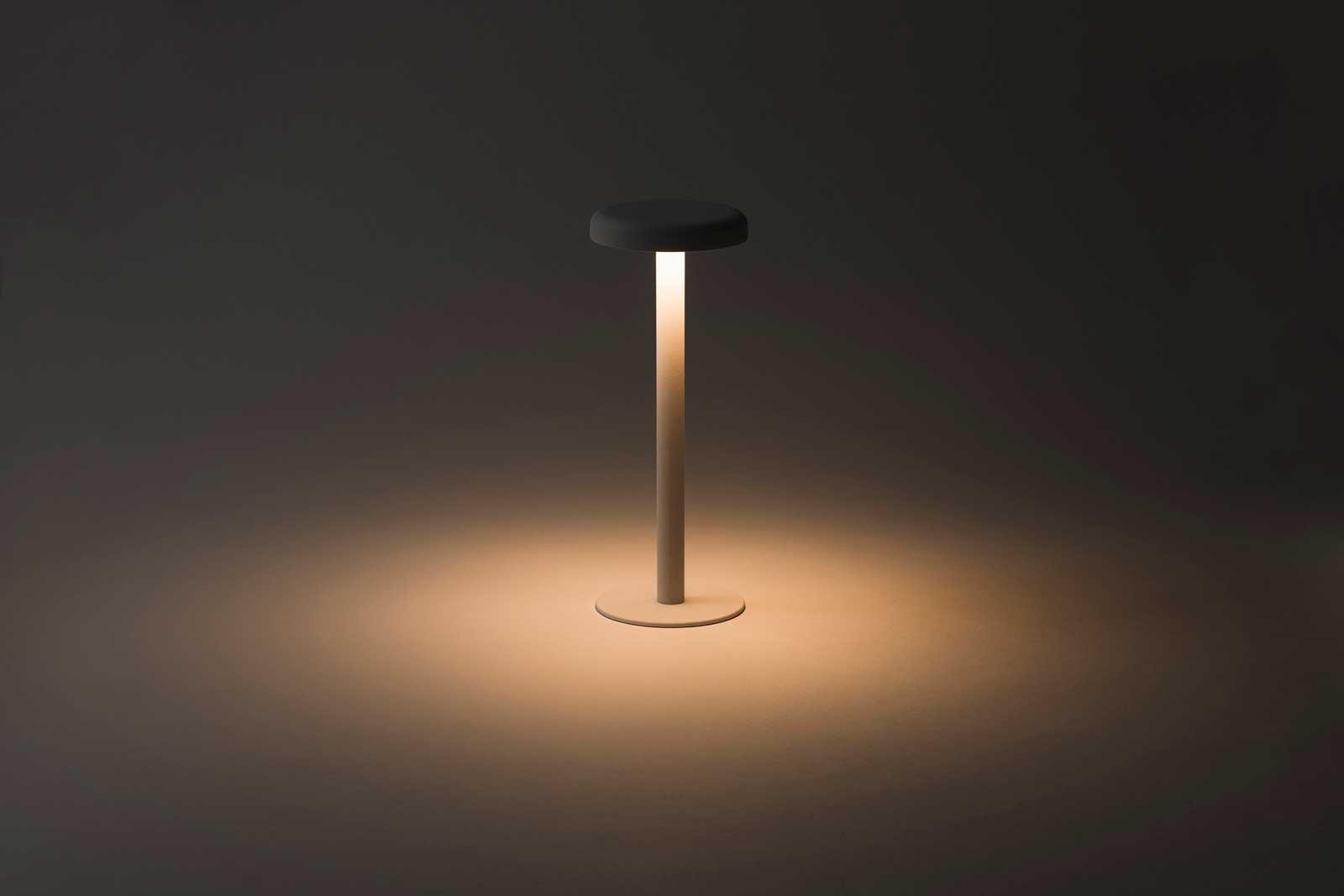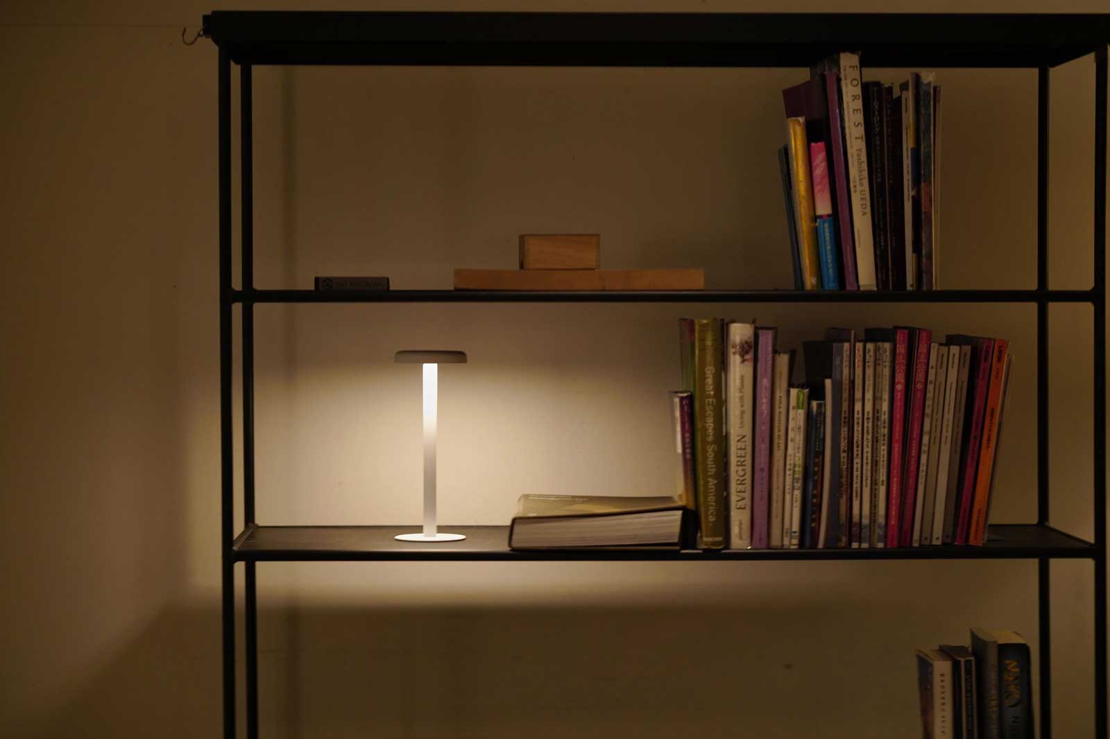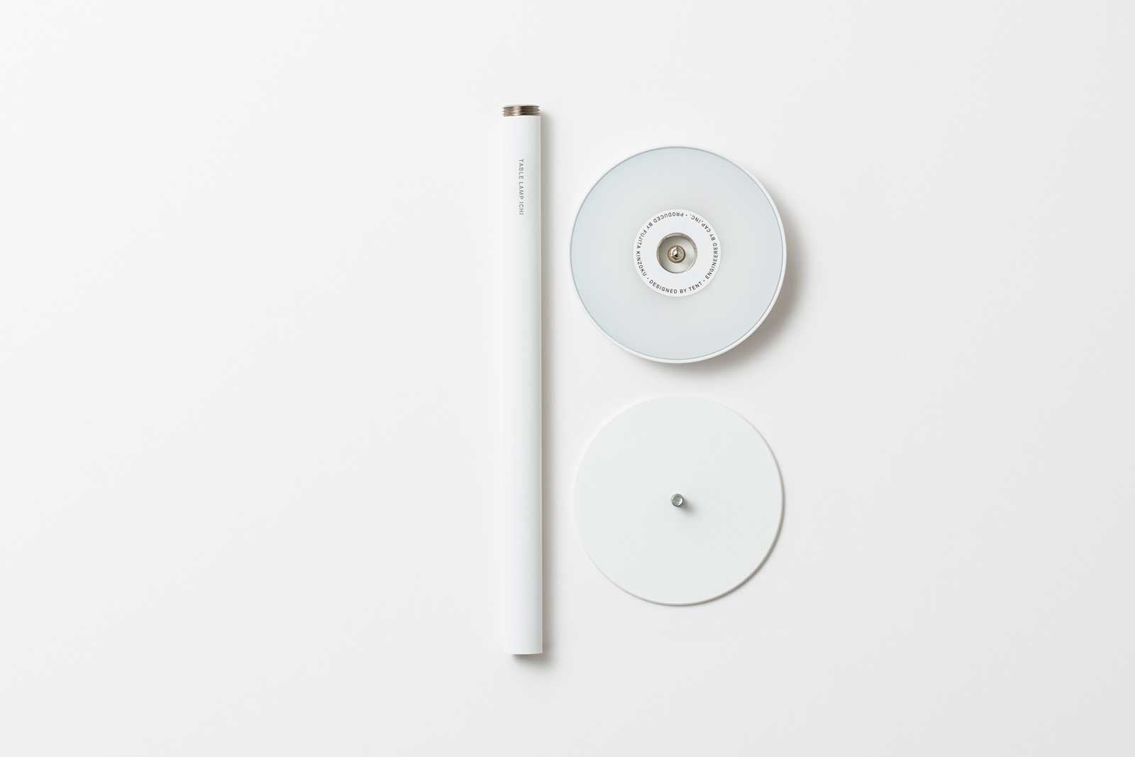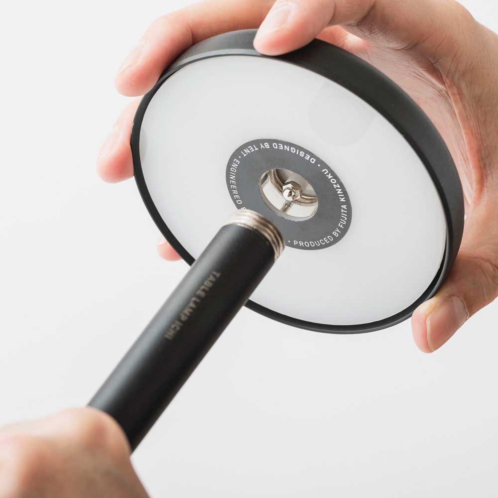 ひとときの居場所をつくるミニマルな照明、テーブルランプ「イチ」。傘をグっと押すだけ4段階の明るさ調整。傘のフチをぐっと押し込むだけ。心地よい手応えのあるスイッチを採用。シチュエーションに合わせ、好みの明るさで使えます。1時間程度でフワっと明かりが消えるタイマーを搭載。睡眠時の消し忘れ防止はもちろん、集中して作業する際の、休憩の目安としてもご利用ください。