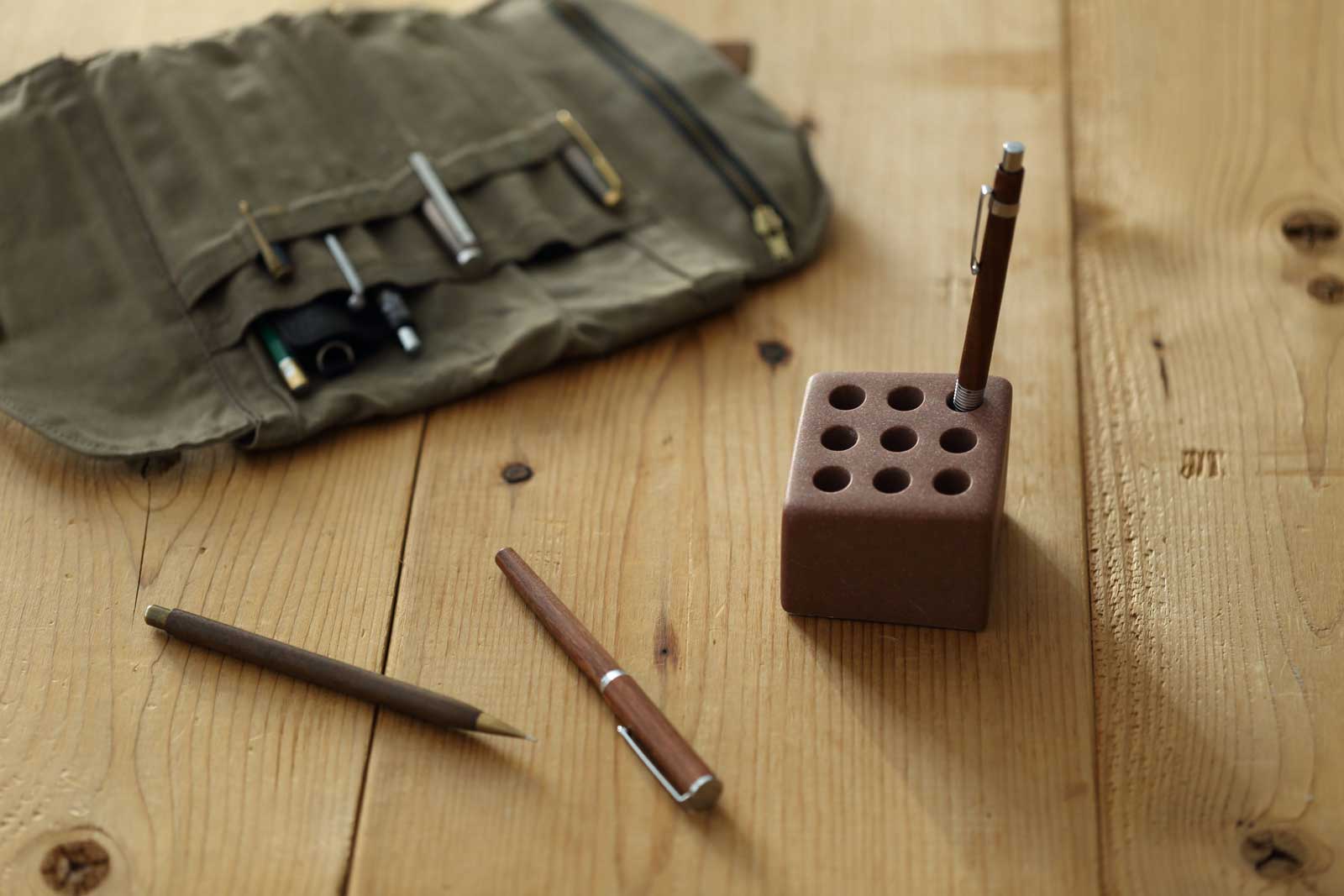 ・注意事項:直径10.5mmを超える筆記具(複合ペンなど)は入りません。滑らかな仕上げですが、強く擦るなど荒い扱いをするとペンに傷がつく可能性があります。本体を引っかくとチョーク跡のような白い痕が出る場合があります。乾拭き(指でも可)で落とせますので、定期的なお手入れをおすすめします。