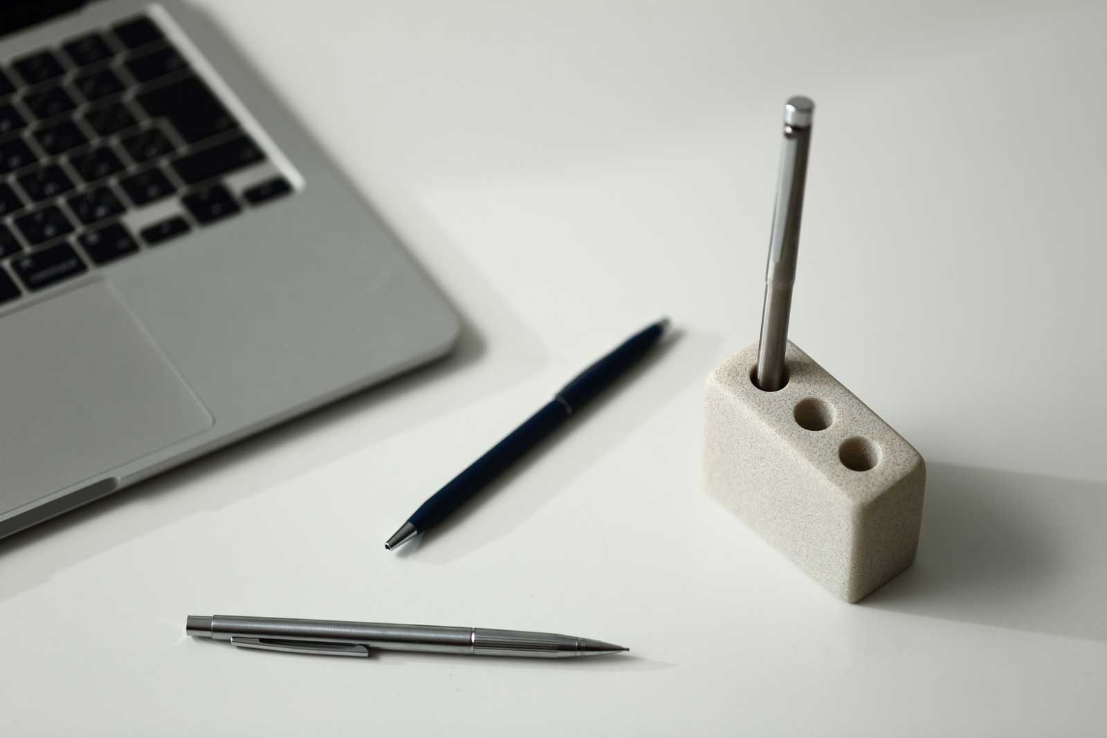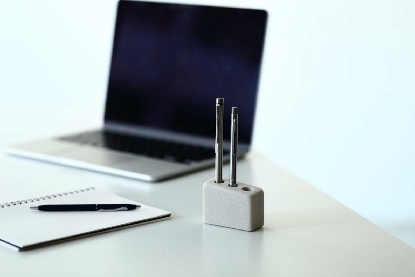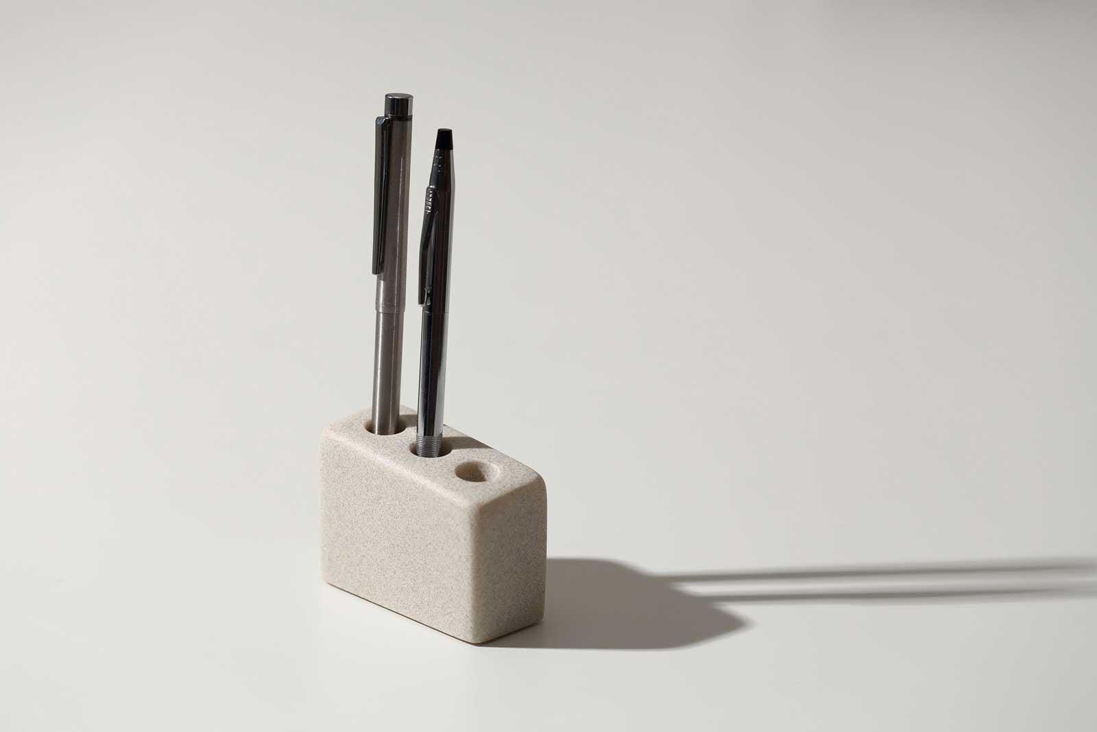 エシカルなPOLYWEAR(ポリウェア)素材。二液性で固形化するポリエステル樹脂と天然石のパウダーを混ぜて作られています。二酸化炭素の排出が少ない製法で作られた、環境にやさしいサスティナブルな製品です。質感は石の表情を感じるマット仕上げ。適度なザラつきを持ちながらも、ペンを傷つけにくい滑らかな手触りに仕上げています。