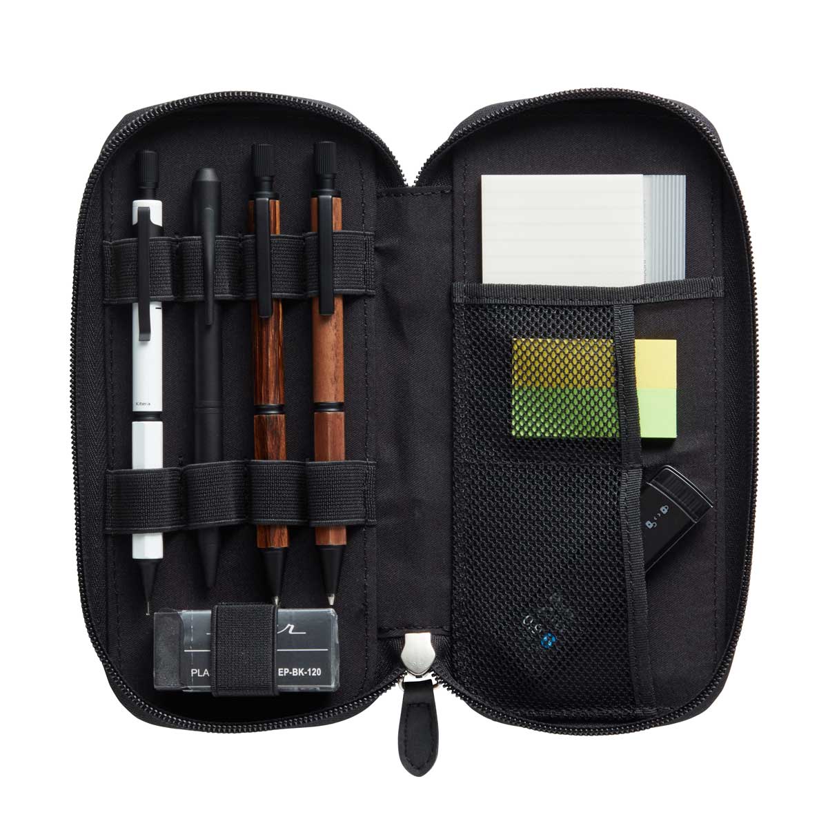 LIFT+ラウンドジップペンケースは、LIFT+世界観を損なわないデザイン。内部に伸縮するゴムループを使用した4本のペン差し、消しゴム収納、右側に3つの収納ポケットを備えた、シンプルかつ実用設計のペンケースです。
