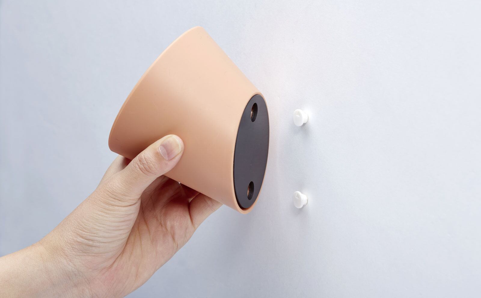 玄関ドアなど平らなスチール面に、マグネットで簡単に取り付け。壁紙の壁には石膏ボードピン(別売)を使って取り付けることもできます。