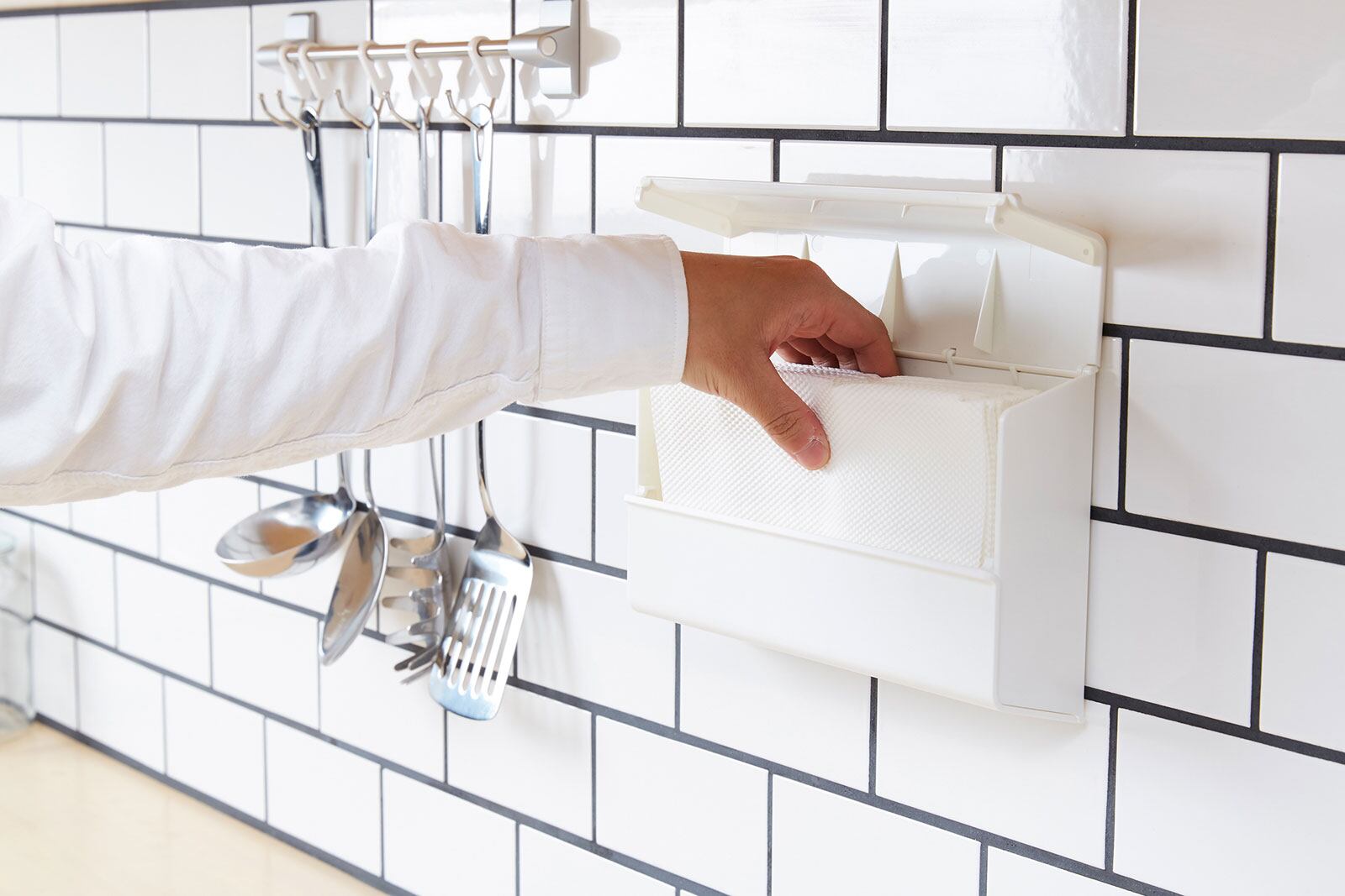 洗面やキッチンなど、タイルの壁からお部屋の壁、冷蔵庫などスチールの壁(マグネット別売り)まで、全ての壁に設置して使えます。ペーパーの取り換えはフタを開いて替えのペーパーを入れるだけ。