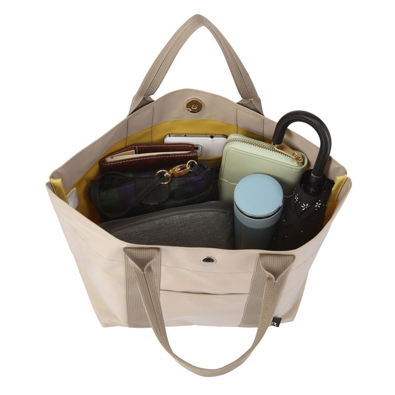 光沢感のあるポリエステル生地で高級感があって、大人っぽさのある魅力的なトートバッグ。ちらりと見えるカラフルな裏地で、視覚的な楽しさと遊び心もプラス。2つの外ポケットは、パスケースやハンドクリーム、消臭スプレーなどの小物収納に便利です。